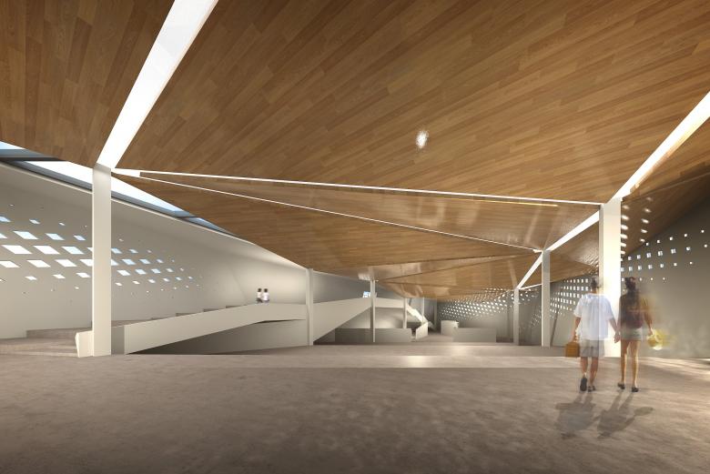 The competition asked for three main programs: multifunctional hall, interactive hall, temporary exhibition space. These are duly and legibly represented as three main crystalline volumes of the project. These solids are connected by a tessellated mesh, and thus internally merged into one continuous yet differentiated space. The main entrance leads into a central daylight atrium from which all the other spaces can be seen and accessed.
