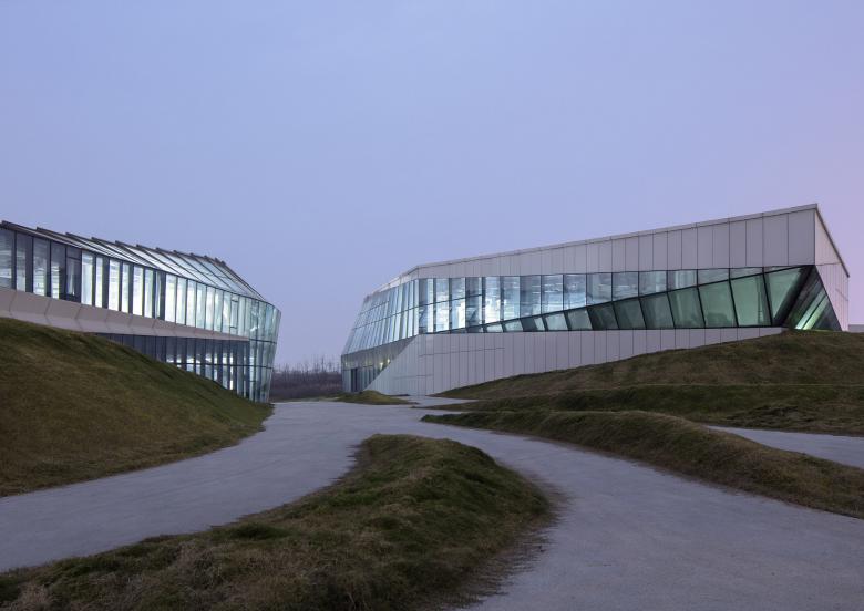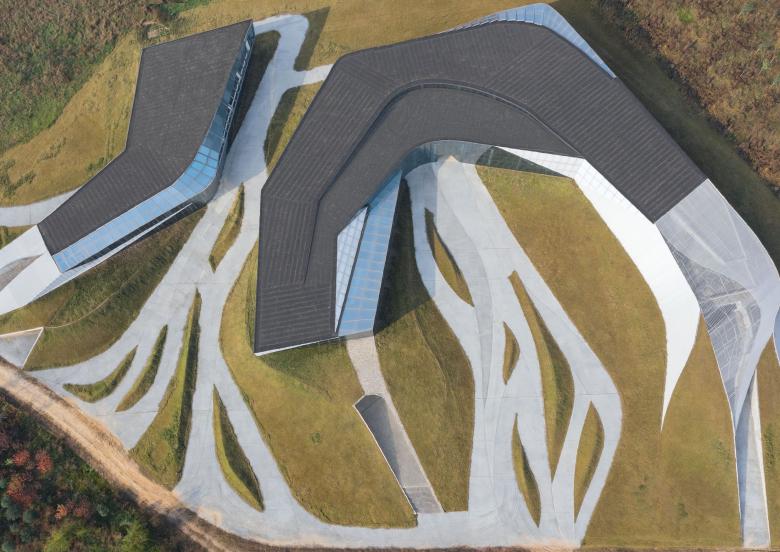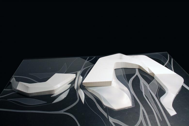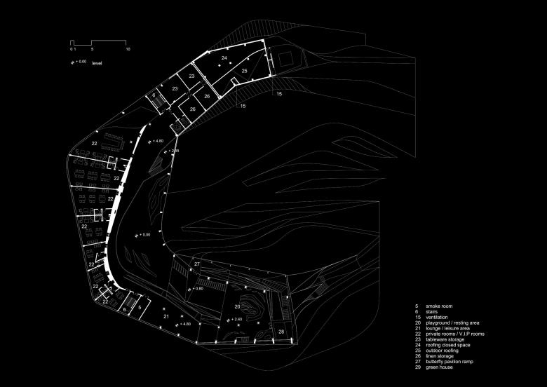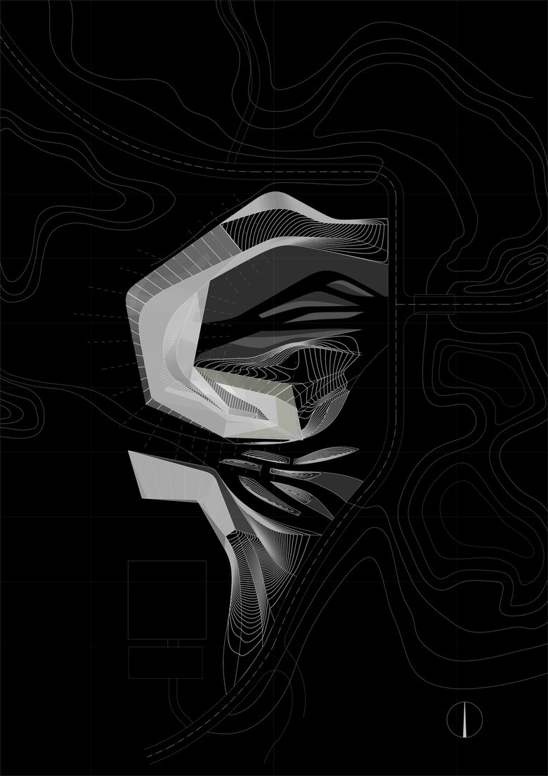 The experience offered to dinners includes picking their own vegetables and following its cooking process. In addition to the dining experience, the project proposes some auxiliary activities such as a children playground and a greenhouse, both included in the internal layout of the restaurant. Such functions and their distinctive spatial requirements—both layout and materiality—are woven into the two ribbon like bodies converging by the entrance. Morphologically speaking, the building grows from the topography at the north, evolving into a sinuous body that splits creating a gap for natural light and a vertiginous volumetric drop at the entrance plaza. Toward the south, it sits onto an artificial higher elevation, hence allowing for a series of ludicrous spaces (children playground and greenhouse) that play with the slopes through some slanted surfaces, among which we locate the main access ramp to the upper floor. The butterfly house is located on the south outer ring of the building. With the comparison of the continuity on the north side, the butterfly house is inserted into the building as a glass case that brings the landscape indoors. At the same time, a series of spaces are generated as an integrated body that interweaves the landscape, the playground and the two main floors of the restaurant. Diagrammatically speaking, the building is a major arc with both of its end points at the lowest elevation (+0.00m) and its middle point at the highest elevation (+3.80m). The three-dimensional spatial distribution resembles a ascendant spiral movement which is actualized by a membrane that more than covering/enclosing the internal area of this arc, augments the rich plasticity of the diagram as such. On the north side, at one of the endpoints, this roof is generated by 5 curves that bifurcate from linescoming out of the surrounding topography. These curves runalong various elevations, working as a veritable extension of theground to the roof of the building showcasing striations and depressions—topographic features in themselves. At the south side, at the other end point, two of the controlling curves of the roof drop dramatically reaching the ground, while the other remaining curves stay at a higher elevation. The former movement generates a “valley”, as seen from the outside. From the inside, this depression articulates the ascendant spiral of the main ramp, onto which the children playground and greenhouse are unfolded.
