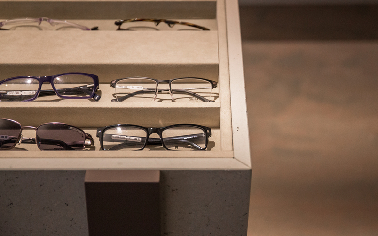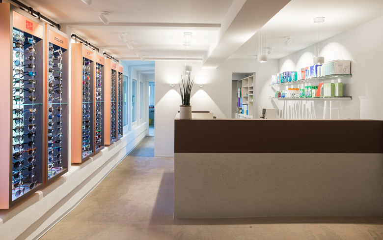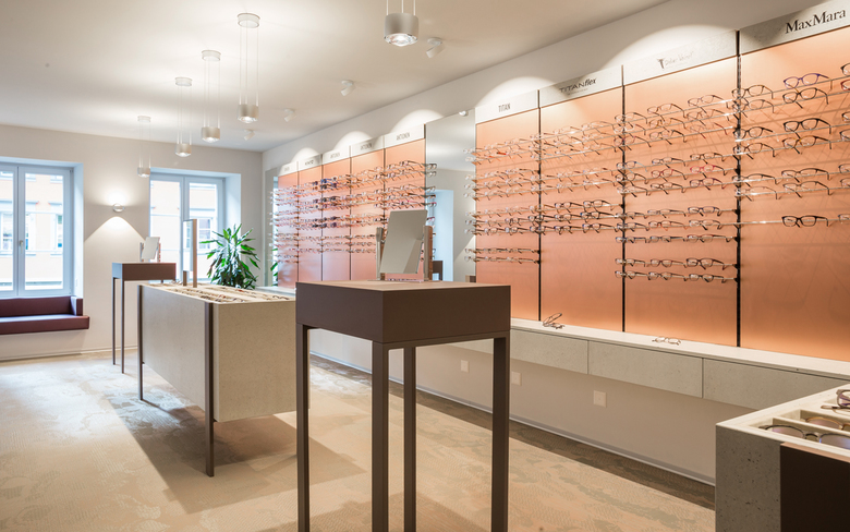 Die Materialkombination von Kupfer, Beton und feinen Grautönen erzeugen einen hellen und leichten Raumeindruck. Eine Kupferplatte dient als Hintergrund für die Brillenpräsentation an den Wänden. Für die liegende Brillenpräsentation stehen Verkaufskorpusse aus Beton im Raum. Zwischen den Korpussen stehen Besprechungstische, konzipiert für stehende Beratung. Nebst den natürlichen Materialien wie Kupfer und Beton, schmückt ein gewobener Kunststoffteppich den Boden. Die eingesetzten Occio Leuchten setzten die Brillen gekonnt in Szene und leuchten den Raum optimal aus.
