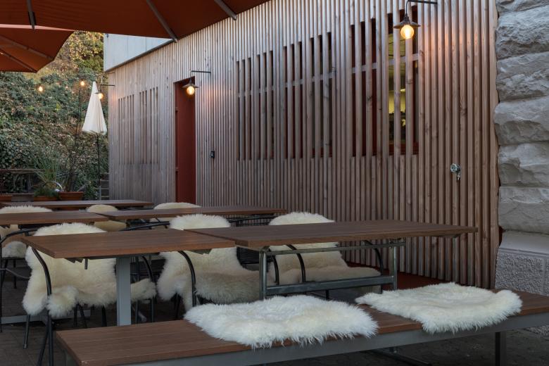 Auch der Küchenanbau wurde aussen neu mit Holz verkleidet und schafft einen schönen Hintergrund für die gemütliche Terrasse.