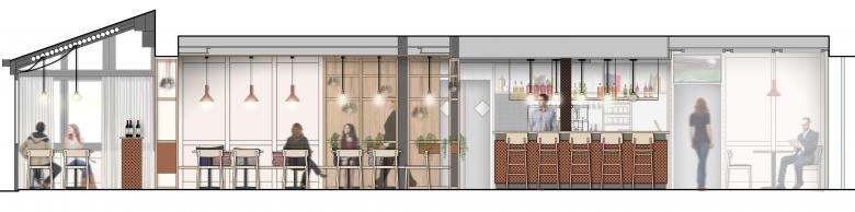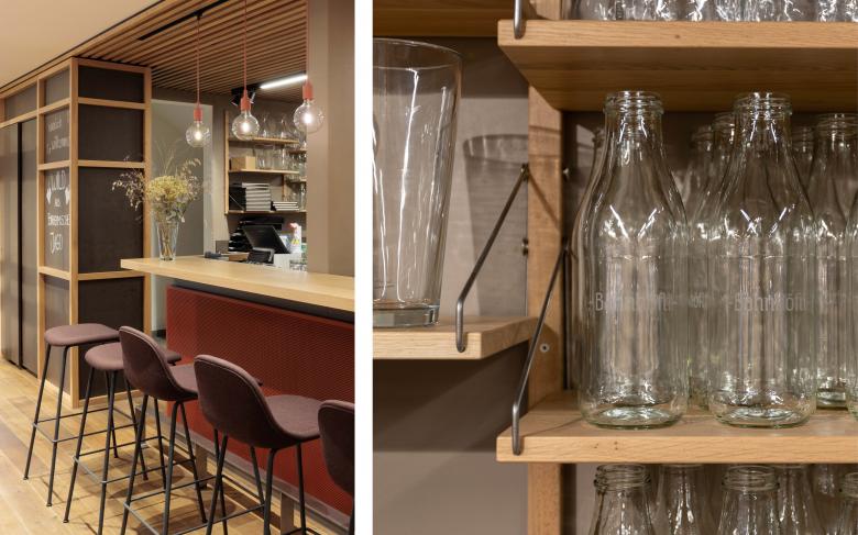 Neben dem historischen Charakter wurde aber auf Modernität nicht verzichtet: Der Barbereich wurde gänzlich erneuert, moderne und traditionelle Deckenverkleidungen greifen ineinander. Schlichte Raumteiler ziehen sich durch alle Bereiche und nehmen auf moderne Art die Strukturierung der Wandtäfer wieder auf. Historische Bilder der Bahnstrecke erinnern an die alten Zeiten, sind jedoch modern mit oxydroten Rahmen und akustischer Wirkung ausgeführt.