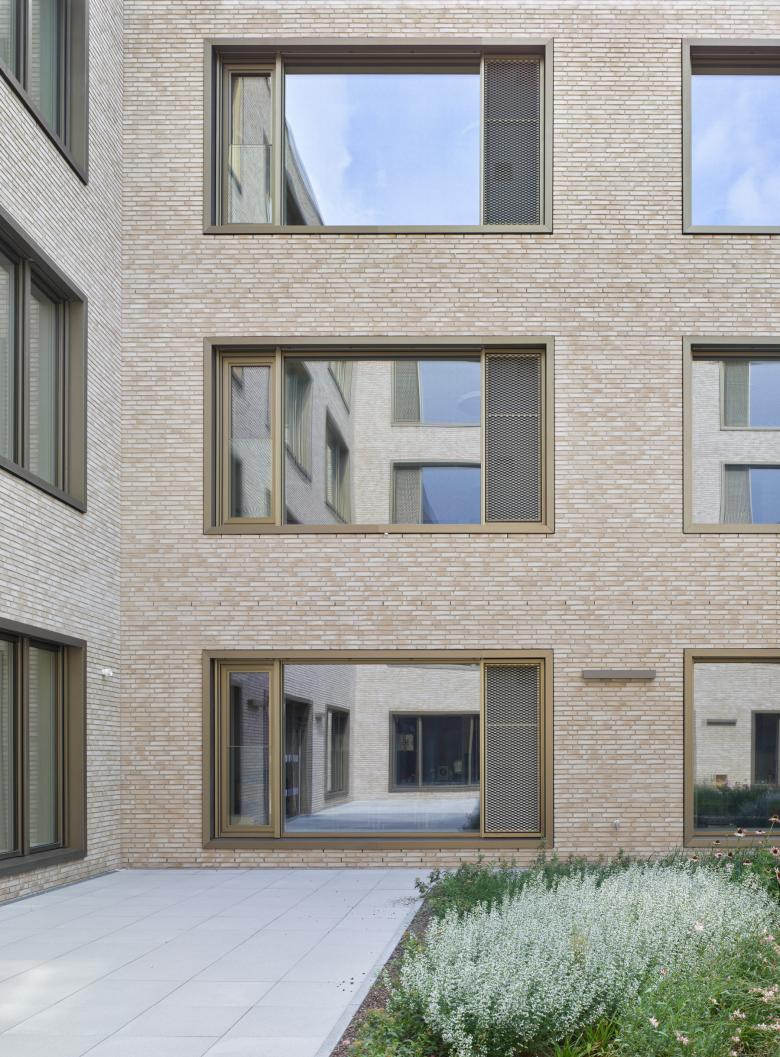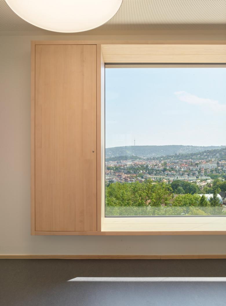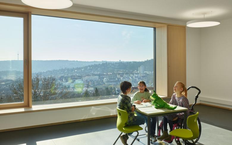Klare Raumstrukturen, rechtwinklige Formen, der Verzicht auf freistehende Stützen oder Versprünge sowie differenziert steuerbare Lichtverhältnisse ermöglichen allen Kindern, sich sicher und selbstständig zu bewegen. Taktil-visuelle Leitsysteme und vollständige Barrierefreiheit gewährleisten, dass auch Rollstuhlfahrende oder Kinder mit Hilfsmitteln uneingeschränkt teilnehmen können. Die Integration des Neubaus in das historische und topografisch anspruchsvolle Gelände schafft natürliche Belichtung, kurze Wege und einen barrierefreien Innen- und Außenraum. Eine Sporthalle im Hang und ein zentraler Innenhof erweitern die Nutzflächen und schaffen vielseitige Bewegungs- und Pausenbereiche.