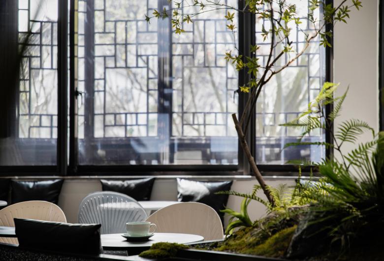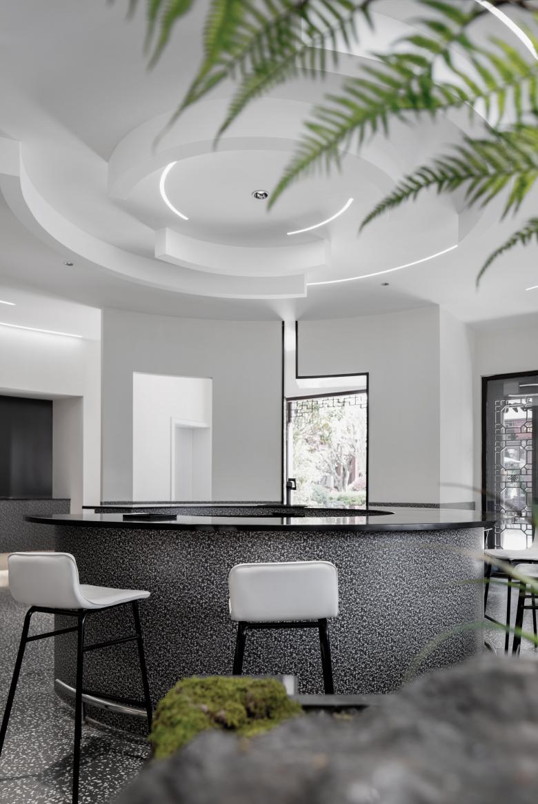 在项目中我们使用深灰色水磨石、黑色石材来营造空间的基调,为了与既有仿古建筑的新苏式肌理形成对比,最后用到一些绿植来调和整体黑白灰的色调。