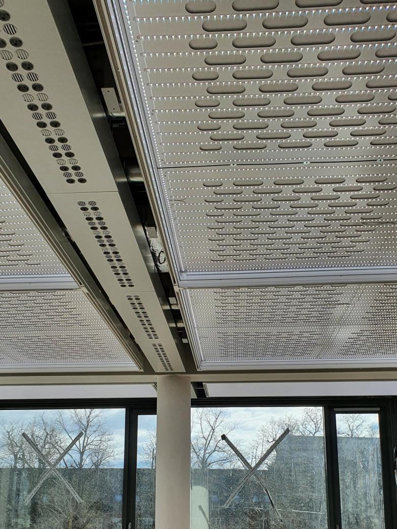Die Luftführung für das Café mit angrenzender Dachterrasse sowie für die Mitarbeiterräume erfolgt über den Schlitzdurchlass INDUL. Die filigranen Durchlassprofile fügen sich in jede gewünschte Deckenarchitektur ein und halten Decken länger staubfrei. Aufgrund der speziell entwickelten Ausblasgeometrie wird die Zuluft in feine alternierende Freistrahlen aufgeteilt, wodurch die Induktion der Raumluft intensiviert wird. Dies wiederum ermöglicht eine sehr hohe Temperaturdifferenz zwischen Raum- und Zuluft und in besonderem Maße die Nutzung der freien Kühlung. Die erforderliche Kälteleistung reduziert sich auf ein Minimum und gewährleistet ein hohes Energieeinsparpotential.