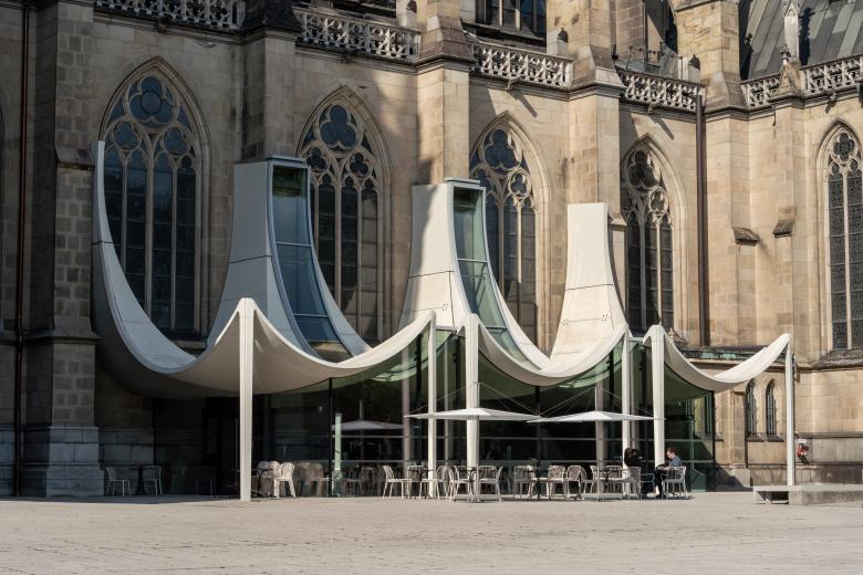 Materialien und Konstruktionen: Entsprechend der steinernen Hülle des Doms wurde eine technologisch höchst anspruchsvolle, frei geformte Betonkonstruktion gewählt, die eine schlanke Profilierung erlaubt. Aus denkmalpflegerischen Gründen wurde der Anbau konstruktiv vom Dom entkoppelt: Die drei Schalenkonstruktionen (zusammengesetzt aus mehreren Fertigteilen) ruhen jeweils auf einer Stütze und ragen vor der historischen Fassade nach oben, ohne diese zu berühren. Die feinen Baldachinstützen an der Längsfassade übernehmen lediglich eine Zugfunktion, um ein Kippen zum Dom hin zu verhindern. Die tragende Unterschale der Konstruktion sorgt für eine spannende Raumatmosphäre, während die obere Schale mit integrierter Wärmedämmung funktionale Aspekte erfüllt und formal an die Gewölbe des Doms angelehnt ist.