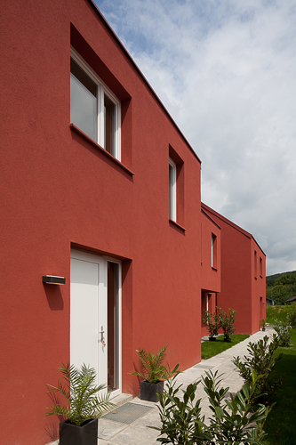 Die beiden Doppelhäuser am dichten und zersplitterten Stadtrand streben nach einer klar erkennbaren Form, ohne den Maßstab zu verlassen. Die Standardfarbe der Dachplatten ist als Hauptfarbe übernommen und steht in Kontrast zu den weißen Kunststofffenstern. Ein pragmatischer Gestaltungsgriff, der den Baukörpern etwas Körperhaftes und doch Künstliches verleiht.