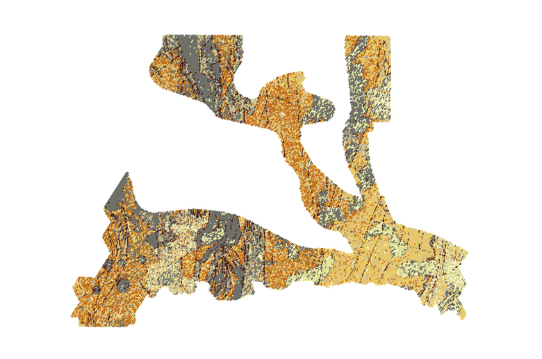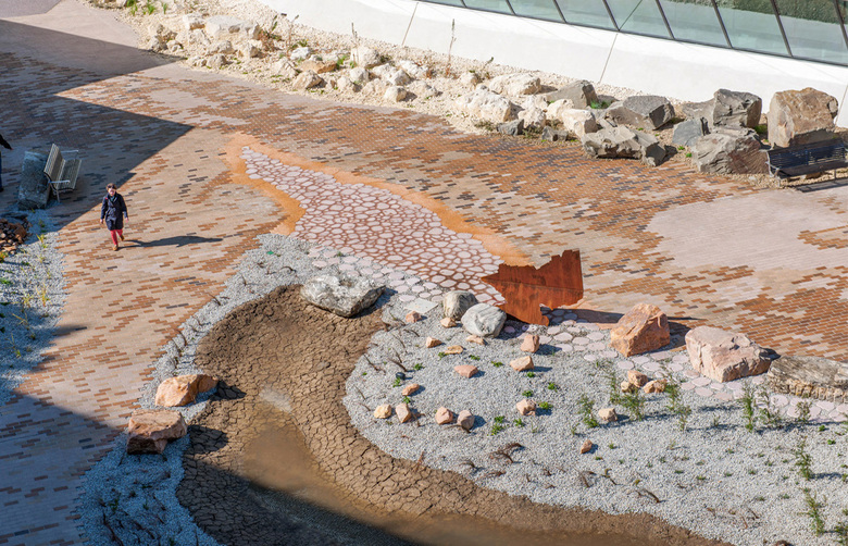 The selection of rocks was arranged around tracings of Victoria’s geological and geographical regions. These include the rocky Gippsland and Otway coasts, the western volcanic plains, the sandy dune fields of the Wimmera Mallee region, the bend of the Yarra River, and the outline of Lake Tali Karng. Artificial landforms drain towards this central cracking clay pan, which holds water for short periods after rain, becoming the ‘lake’.