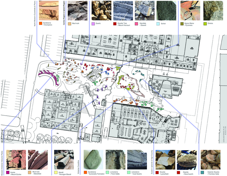 The design brief was developed with the staff of the School of Earth, Atmosphere & Environment, based on a sketch map of the ‘underlying’ geology to which all garden rock specimens needed to be aligned, and the desire for students to be able to map and understand the hidden forces involved in geological formations. Specific rock types of Victoria were to be included for detailed study. The new garden has set a precedent for the teaching of geological sciences and is used by all year groups, in particular for outdoor teaching with first year students.