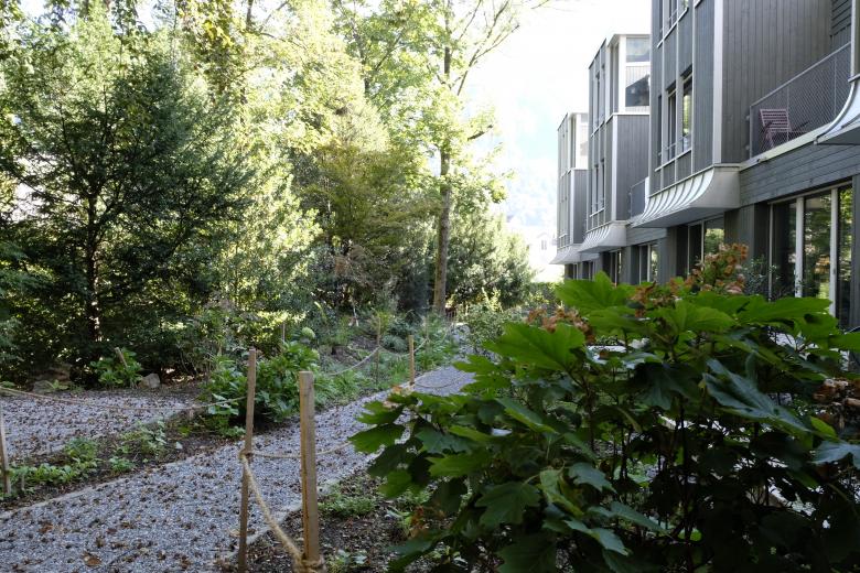 Durch die subtile Setzung der Neubauten am Südrand des historischen Gartens konnte dessen Substanz zu einem grossen Teil erhalten werden. So vermag der Garten trotz verminderter Fläche ein Gefäss zu bilden, welches den fünf Familien ein zuhause ist.