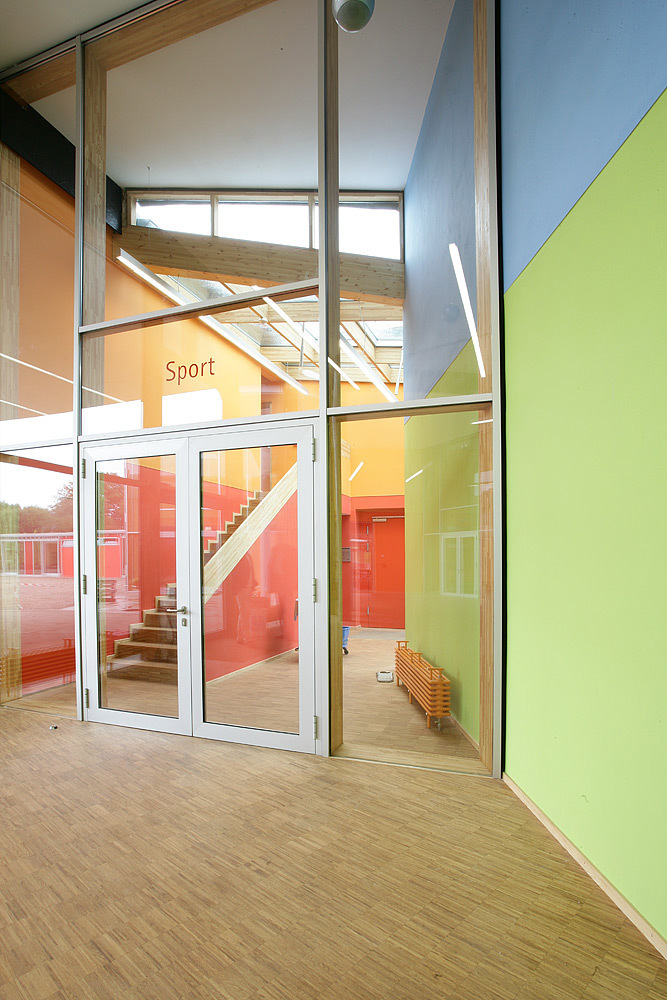 Technische Besonderheiten und Innovationen: Weit gespannte Flachdecken, Spannbetonhohldielendecke über der Sporthalle, optimierte Flächengründung mit Baugrundverbesserung durch Rüttelstopfsäulen vor dem Hintergrund bergbaulicher Randbedingungen.