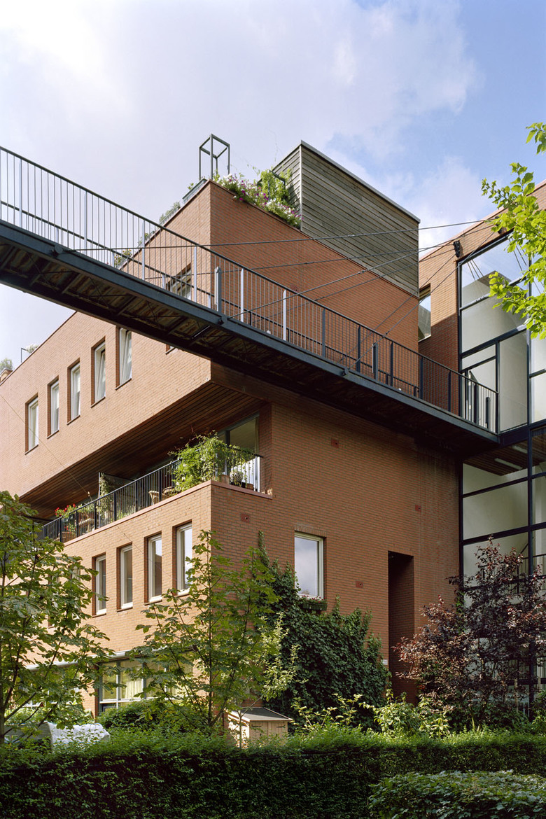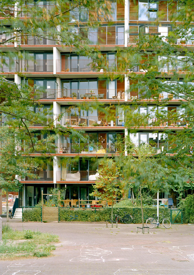 The site has a density of 100 dwellings per hectare and includes communal housing, live/work dwellings, a community centre and other amenities. On its western and northern sides the site is enclosed by a meandering residential block that climbs from four storeys in the South to nine in the North-East. This elongated block contains approximately 57 % of the dwellings and forms the boundary between the business activities and the residential area; it also protects the site from the westerly wind and from the noise of the Haarlemmerweg trunk road. Together, the 14 blocks of four to five storeys form a park-like setting. They stand on green islands with private gardens surrounded by hedges.