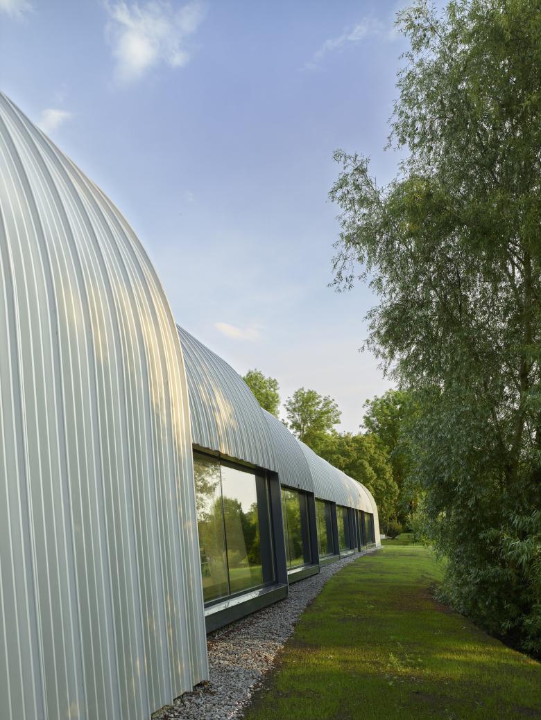 Das Kellergeschoss als auch die Becken, die mit einer aufgeständerten Edelstahlauskleidung versehen sind, bestehen aus einer Stahlbetonkonstruktion. Das Dachtragwerk des Neubaus sind gebogene Leimbinder aus Holz. Die opaken Fassadenflächen in Dach und Wand sind mit eloxiertem Aluminiumblech verkleidet. Die transparenten Bauteile sind Stahlpfostenriegelfassaden mit 2- oder 3-fach-Verglasung.