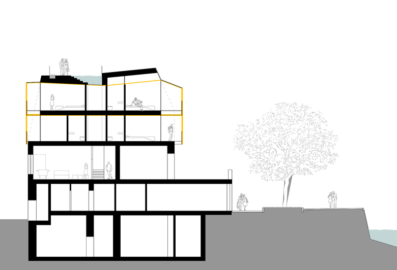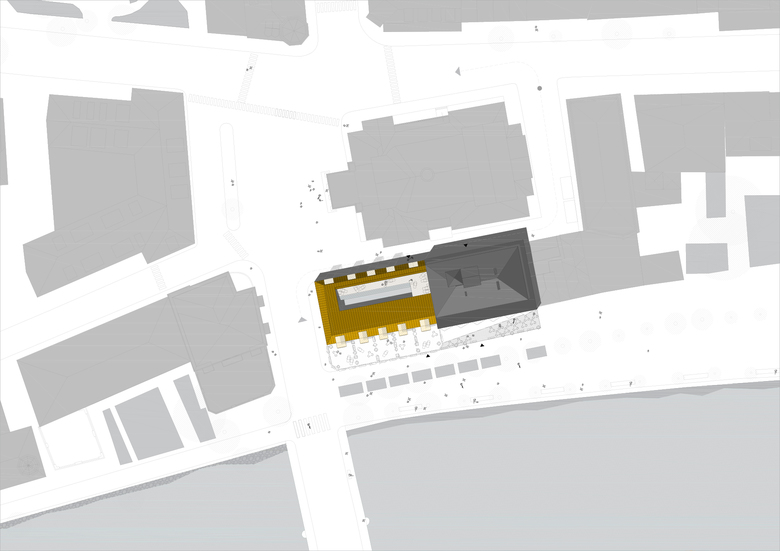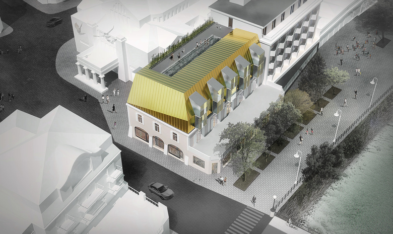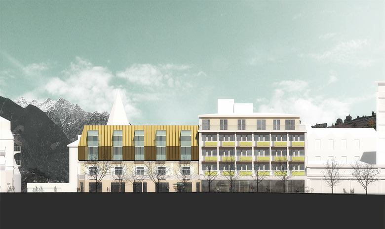 The extension of a hotel that draws attention to itself without disturbing the view of the prominent historical context and without dominating the existing whole.
