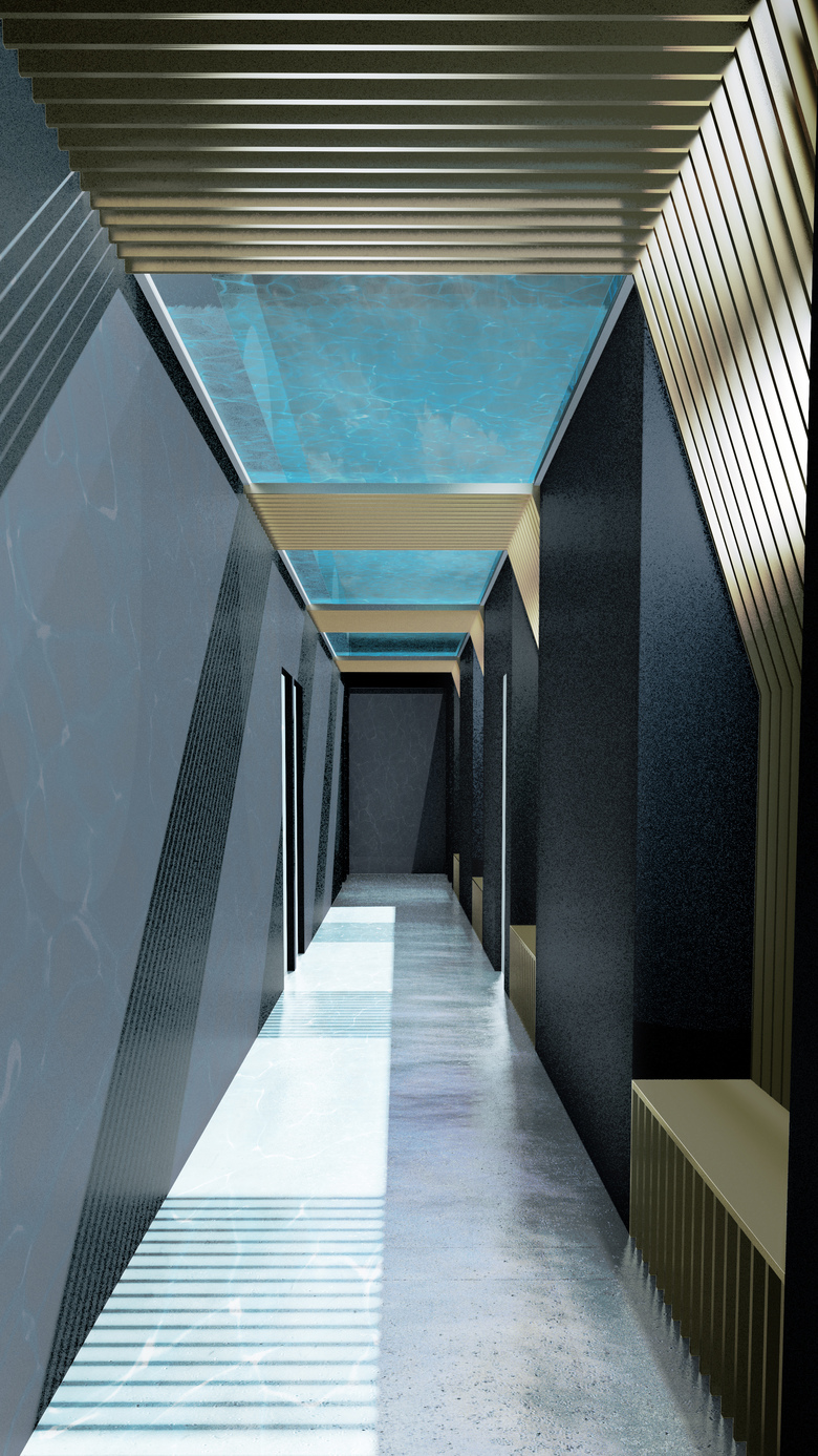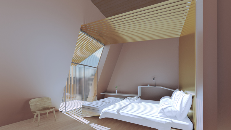 At the same time, the project should be a visual continuation of the existing hotel with its fascinating rhythmic façade overlooking a promenade along the river and the thermal baths of the town. The volume of new room’s wing should not be read as a façade but as the surface of a pitched/inclined roof: the new intervention is separated from the existing through a small shadow gap, while a deliberately slightly-bent surface structures and breaks the volume and attracts at the same time the viewer’s gaze. The chosen material for the intervention is brass which repeats the material language of the surrounding liberty architecture as well as the interior of the existing Hotel. The new volume takes up the rhythm of the underlying existing façade and translates it into dormer-like glass structures that form balconies for the rooms.