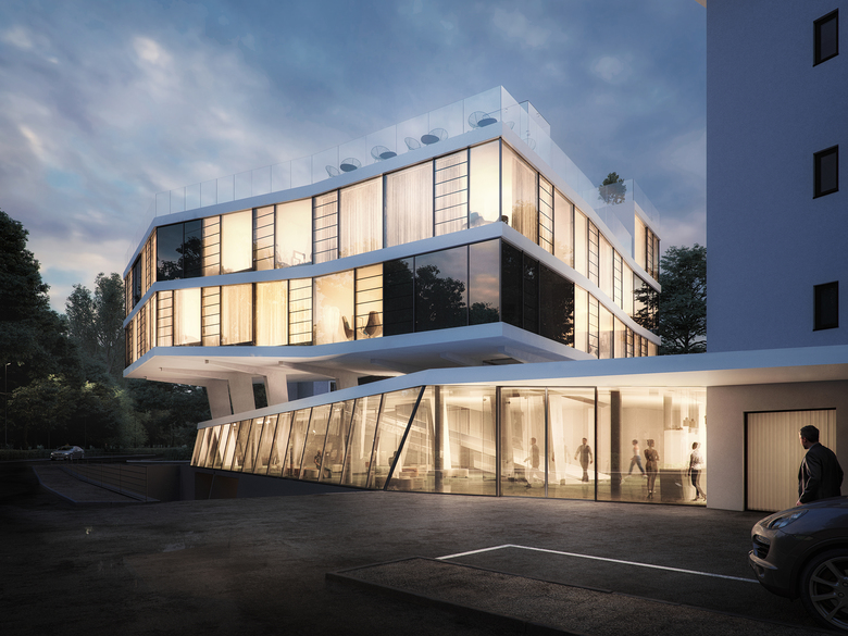 Die eigenständige Form des Neubaus, der relative Abstand, lassen eine Konkurrenz mit dem Altbau erst gar nicht entstehen. Die Solitäre stehen für sich autonom und sind nur im Erdgeschoss über eine gemeinsame Lobby verbunden.