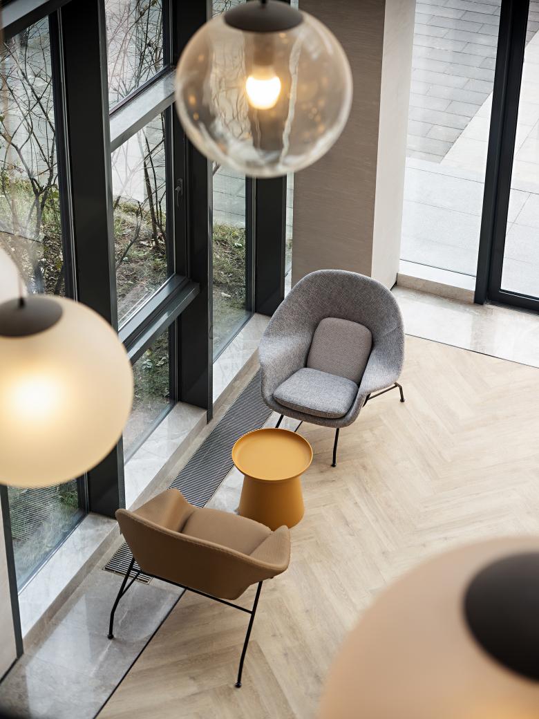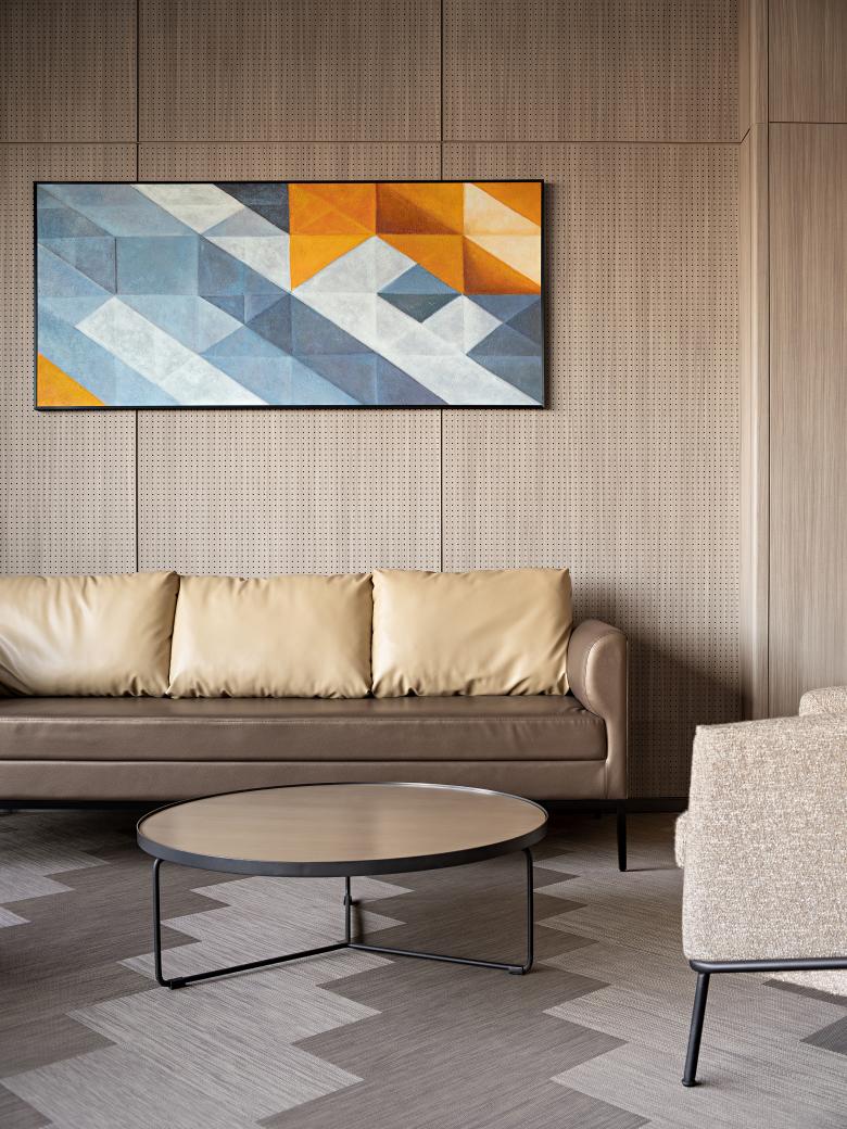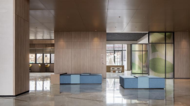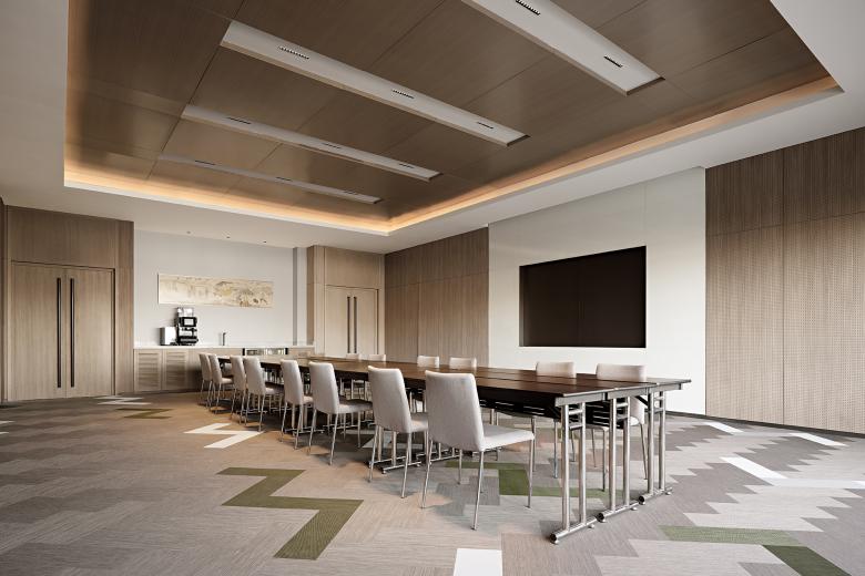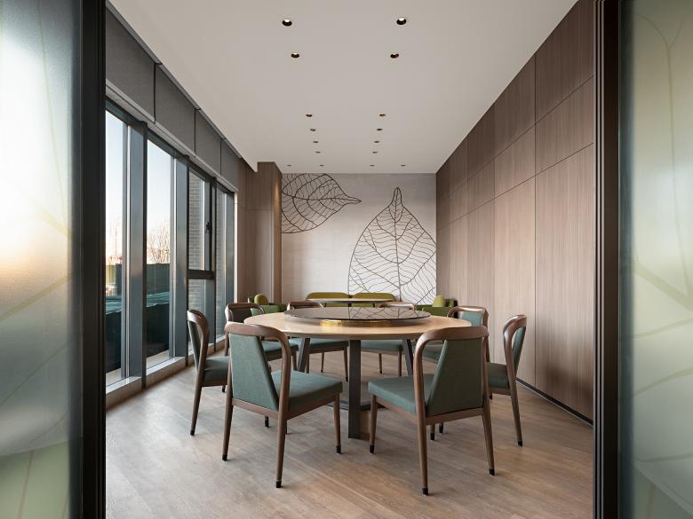 On the other side of the restaurant are the meeting room and fitness area. Large, medium and small spaces can be flexibly arranged in the meeting room. Warm wood color is the basic tone, and the floor adopts woven rubber floor with geometric pattern, creating a light and modern, relaxed but solemn feeling. The ceiling and floor of the gym continue the geometry element of the meeting room, with bright and light colors. Through floor-to-ceiling glass, it is visually connected with the public corridor, and an energetic atmosphere is achieved.