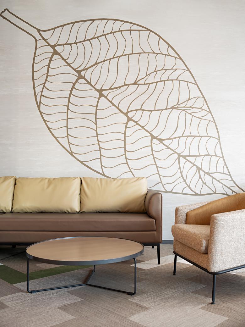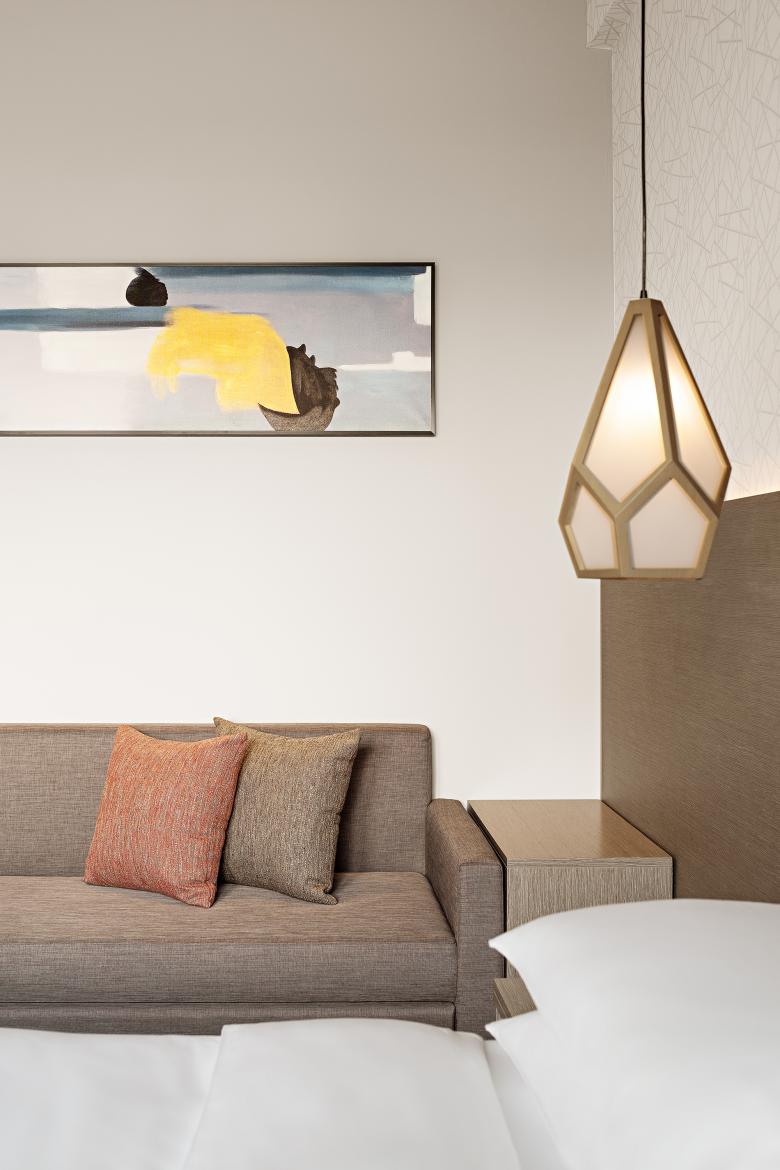 The lively geometric elements from ground floor, extends to all public area and upper floors, on floor carpets and wallpaper of the guest rooms throughout.
