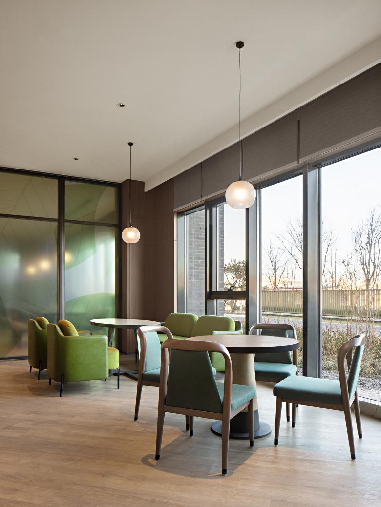 Due to the hotel's moderate scale and highly flexible and multifunction spaces, the design is coherent throughout yet giving focus to various spaces. Light wood, as a natural material to integrate the hotel's tone, giving a warm and welcoming feeling, well placed as a legacy of the International Horticultural Exhibition. The natural texture of the flooring harmonizes with the pale green graphics application to the walls to create a casual, family friendly atmosphere.