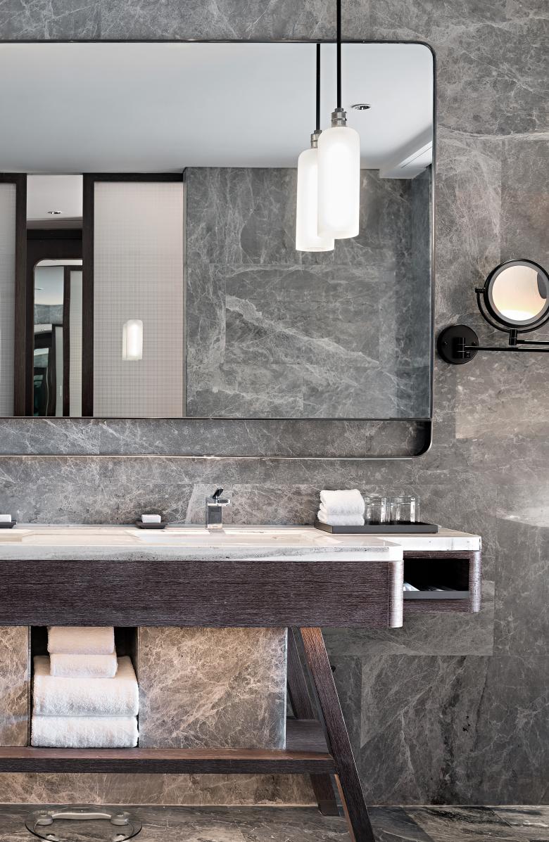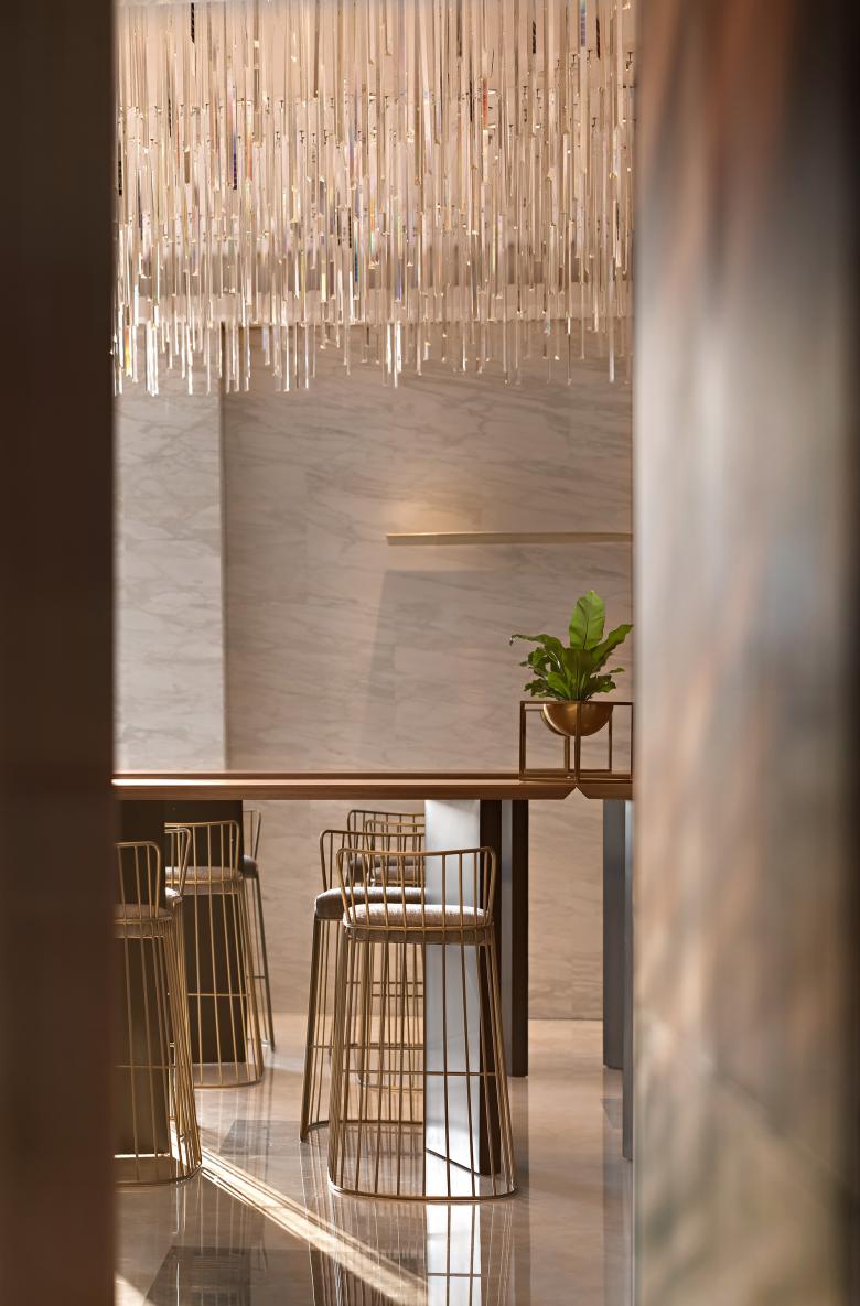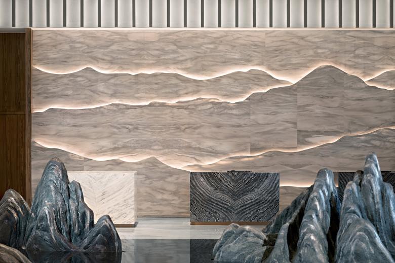 Lobby design is inspired by the mountain landscape and the Great Wall in Badaling. Using layers and overlapping big slabs of natural marble with lighting effect to create the endless mountain silhouette as a back drop for the reception. A large scale contemporary copper metal mountain sculpture with rain glass drops suspended at the centre of the lobby, echo with the dark natural stone installation art on the floor become a focal point of the entire lobby.