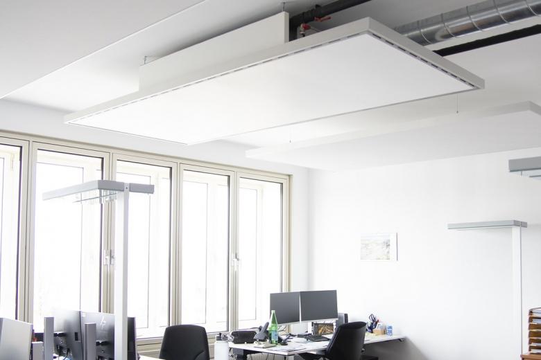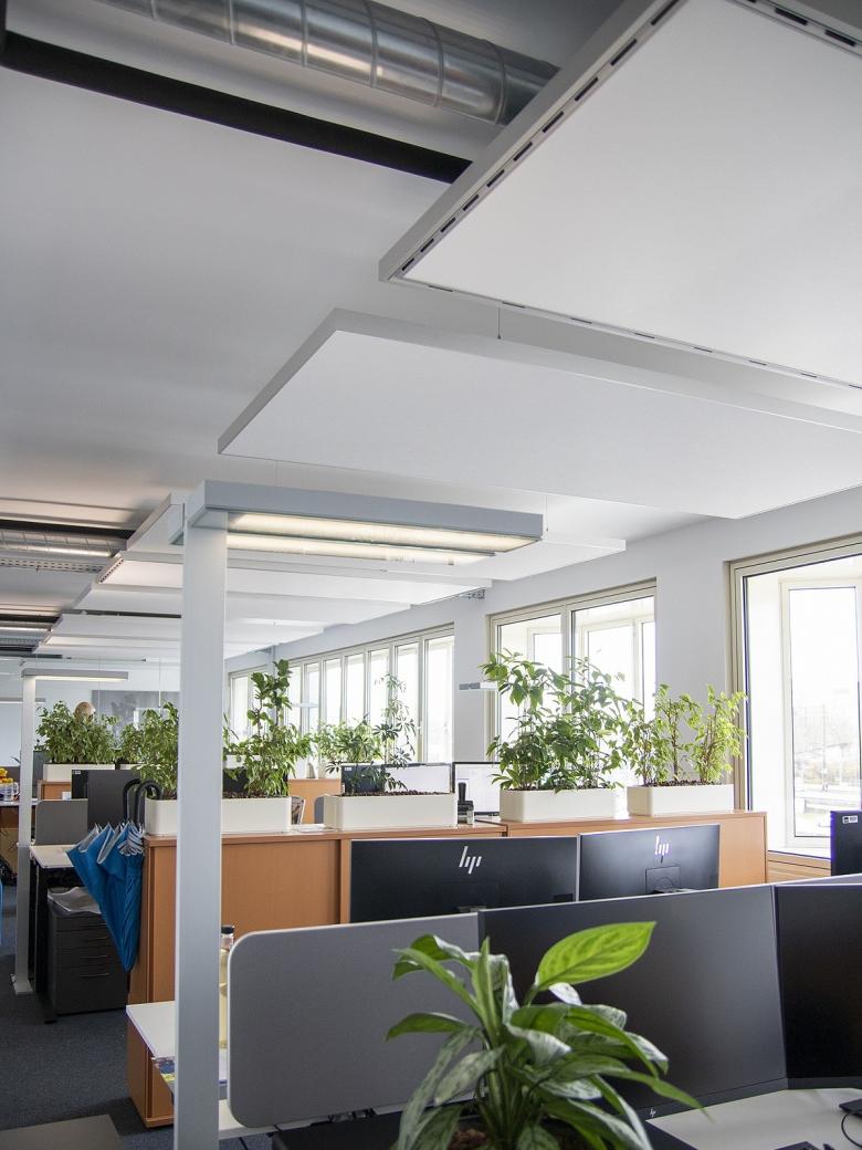 Für das großflächige Büro mit dem offenen Raumkonzept wollten die Planer ein einheitliches Kühlsystem, mit dem die verschiedenen Bereiche, mit oder ohne abgehängter Gipsdecke, effizient und unter Einhaltung höchstmöglichen Komforts belüftet und gekühlt werden können. Kühlung und Lüftung sollten also teilweise freihängend und sichtbar oder in der abgehängten Decke untergebracht sein. Auf dieses Anforderungsprofil passt das Akustiksegel INDUSAIL SONIC plus einfach perfekt. Das Segel gestaltet durch die vielseitigen Montagemöglichkeiten, frei oder in die Decke integriert, die Räume mit und verbessert mit dem Umluftkühlgerät die Raumluftqualität maßgeblich. Die Umluft, bzw. bei optionaler Frischluftanbindung die Mischluft, wird über hochinduktive Schlitzdurchlässe eingebracht. Das Segel unterstützt zusätzlich, ohne eine aktive Beleuchtung, nur auf Grund seines hohen Lichtreflexionsgrades von > 90 %, alle wesentlichen Beleuchtungsarten. Die Anordnung der Deckensegel kann optimal an die räumlichen Gegebenheiten abgestimmt werden, egal ob als Einzel- oder Gruppensegelanordnung. Kiefer hat die Bauherren also nicht nur aus technischer Sicht, sondern auch aus optischen Gründen mit dem INDUSAIL SONIC überzeugt.