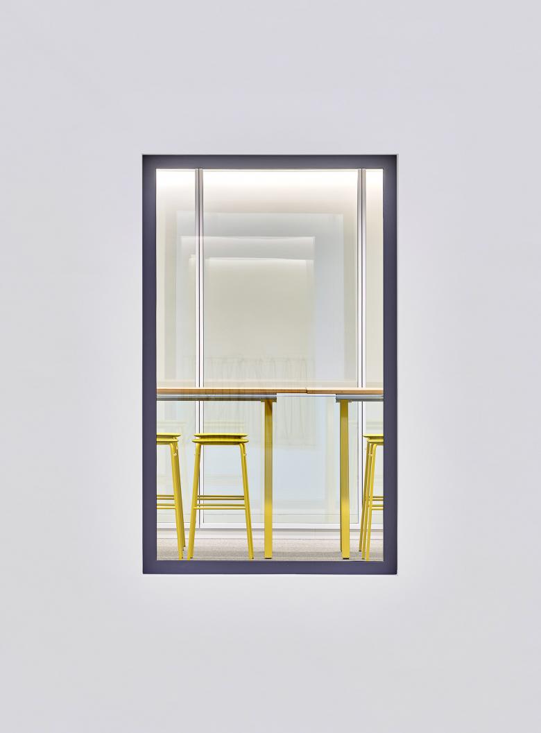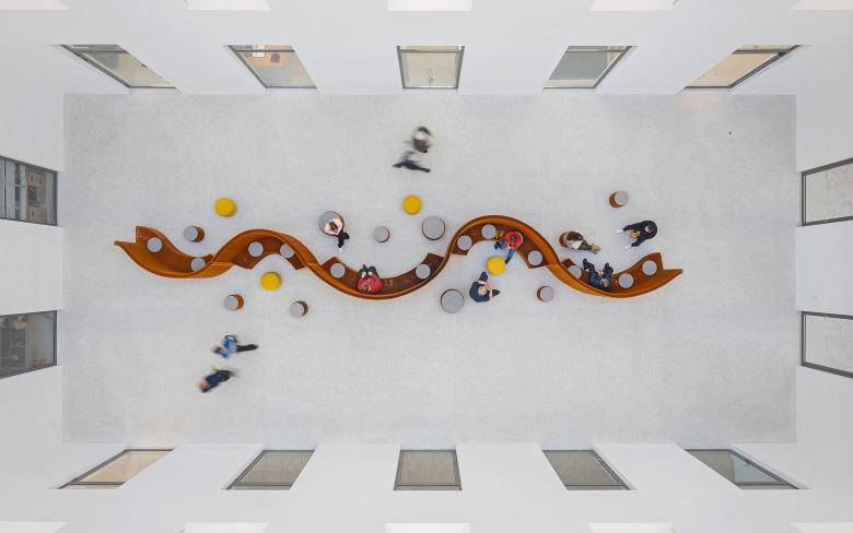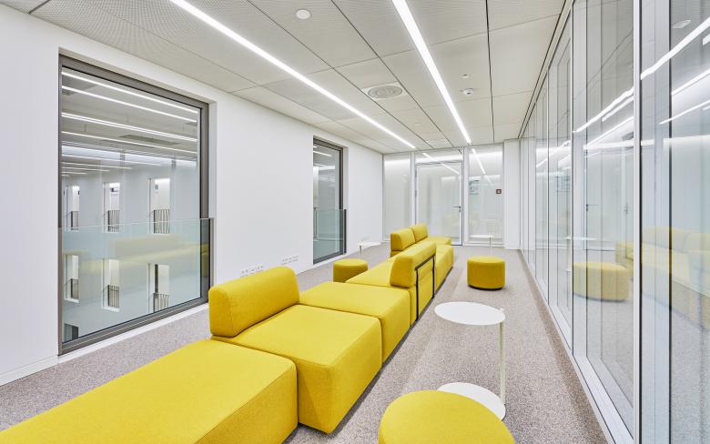 Ein flexibles Möblierungskonzept für das Atrium sieht organisch geformte Sitzmöbel aus gefaltetem Papier vor, die einen Kontrast zum rein rechtwinkligen Raum bilden. Sonnengelb wurde als Leitfarbe für die Möblierung der öffentlichen Bereiche gewählt, als Ergänzung zu den neutral in Weiß gehaltenen Innenräumen.