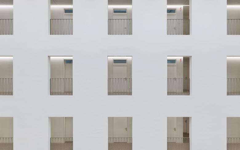 Auf der gegenüberliegenden Seite befinden sich die Werkstätten – das kreative Herzstück des Hauses. Die Obergeschosse sind offen gestaltet - alle Räume haben Bezug zur gemeinsamen Mitte. Ein um das Atrium laufender Gang verbindet die Büros der Wissenschaftler:innen und der Verwaltung mit den Laboren sowie den Besprechungsräumen. Alle Arbeitsräume sind an der Außenfassade angeordnet. Unmittelbar davor, entlang des Atriums bietet sich Raum für Pausen, Besprechungen und informelle Kommunikation.