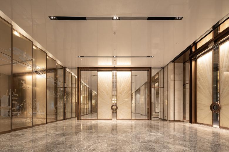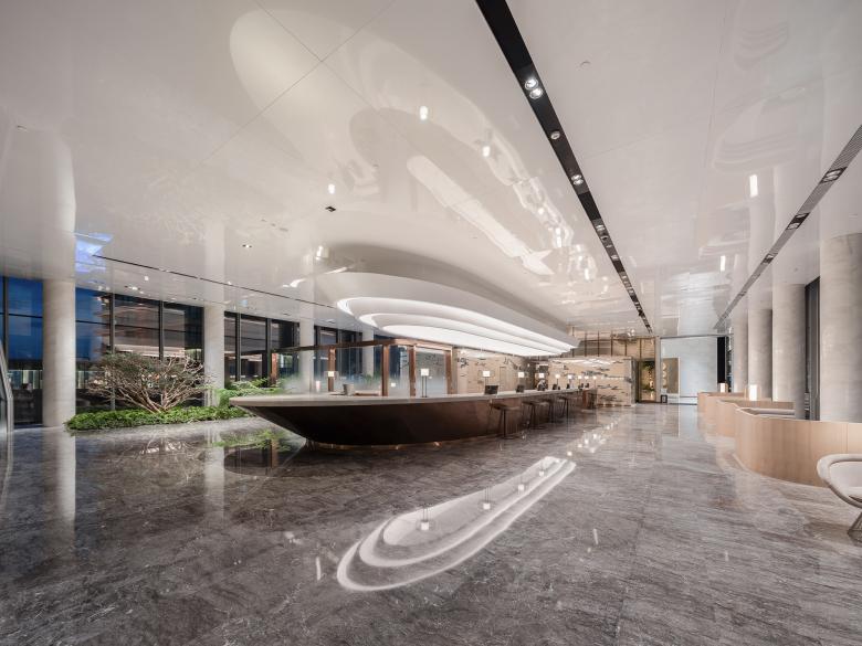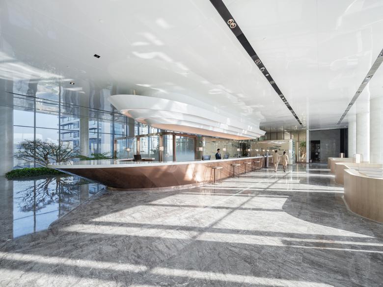 The shape of a sailing vessel is employed in the reception area which is equipped with arc-shaped lighting devices. The shape design echoes the water reflection during sailing in the river. Under the natural light, the inside and outside scenery forms a connection.
