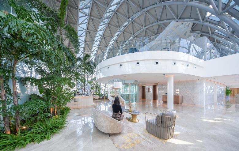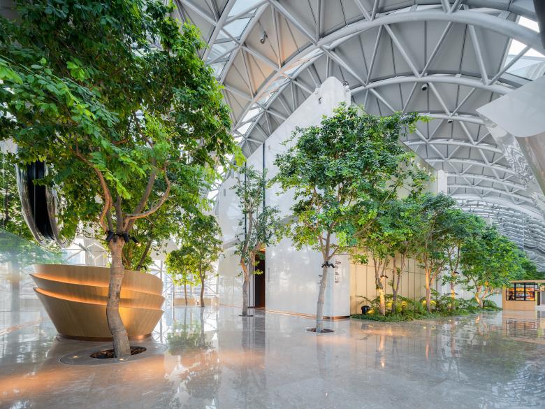Under the towering arc-shaped dome, green plants grow freely upwards in an array, combined with the round wooden seats under the tree, highlighting the lounge's cozy style.