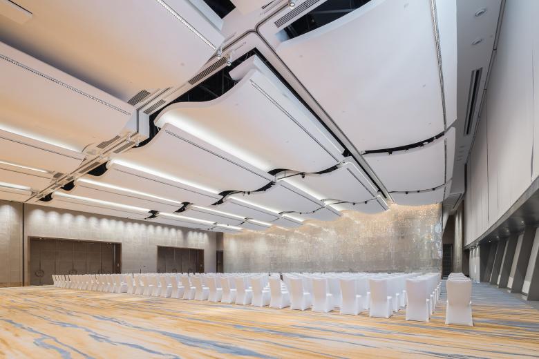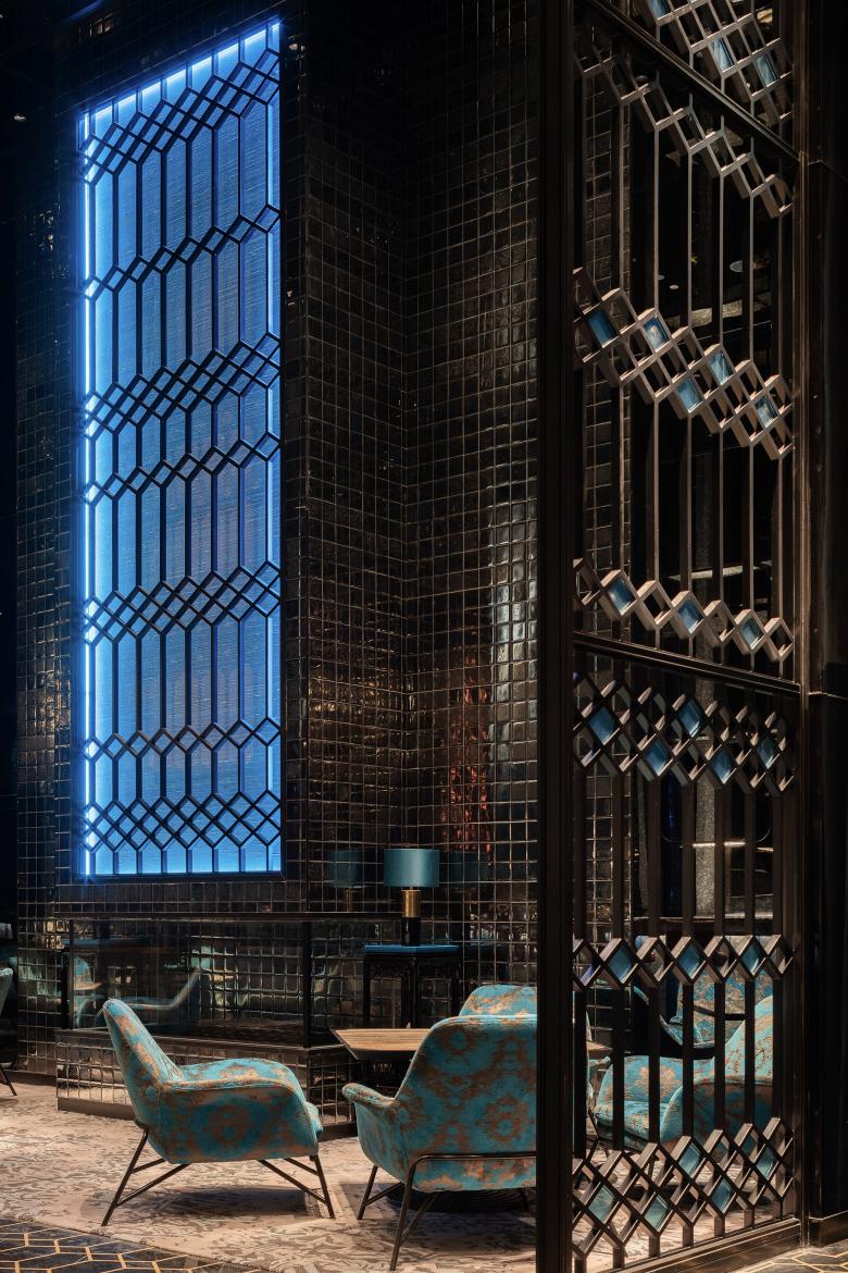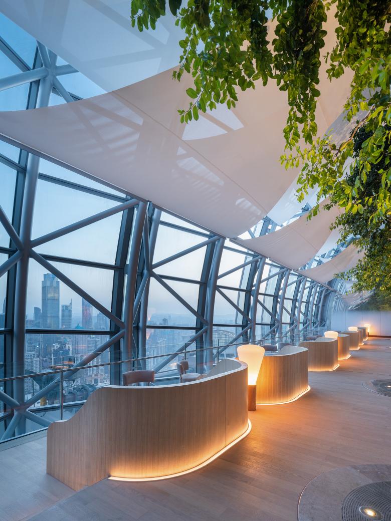 The hotel has its grand reception at the crystal sky bridge on level 42, which is also where the lounge and specialty restaurant “Jing” are located. The hotel has 380 custom designed guestrooms and suites above the 250-m-high sky bridge. A contemporary concept for the hotel interior compliments the iconic architecture by extending the sail metaphor inside. Based on the nautical aesthetics, the streamline features are interwoven with touches of Chinese motifs and crafts, moving and flowing from the ground entrance to the crystal sky bridge.