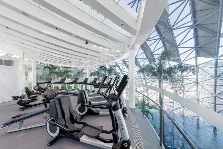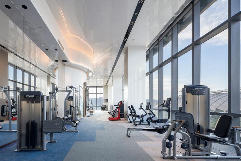 The gym and swimming pool are located on the 43rd floor of the hotel. There is a special viewing lounge area on the side close to the French windows, where guests can appreciate the beautiful river view while exercising.