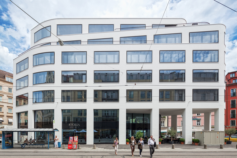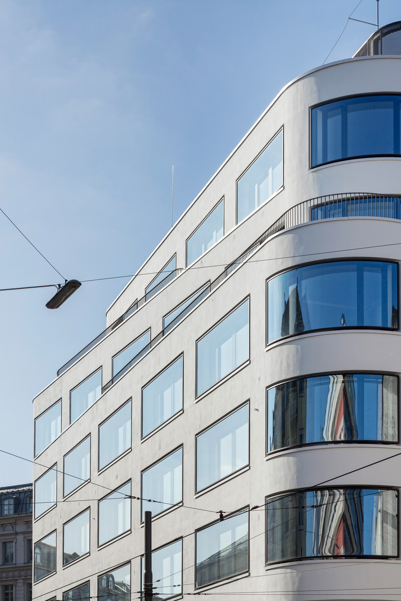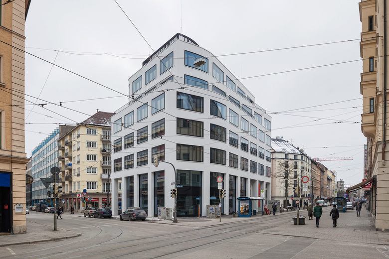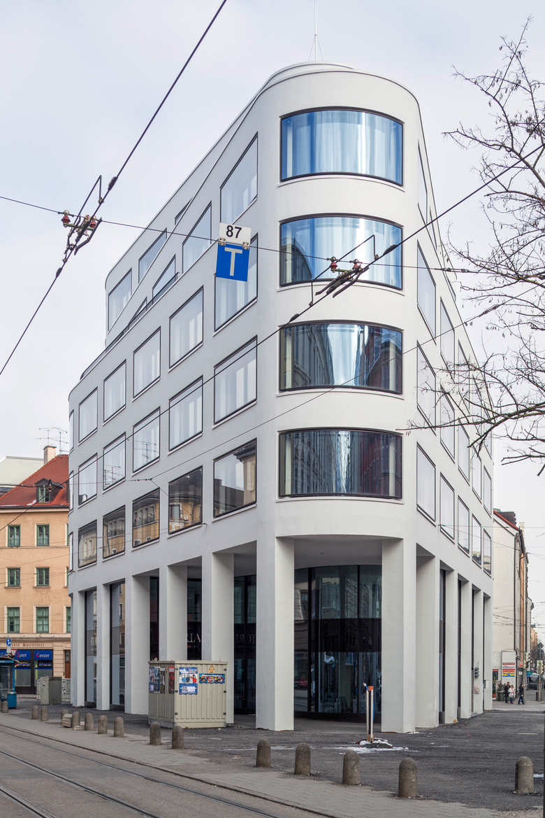 This six-story office building stands on a triangular lot in Munich’s central Maxvorstadt district. Independent yet integrative, it is a solitary structure that fits flawlessly with its surroundings. In echoing the unusual shape of the site, it is a singular structure with three facades fluidly joined by rounded corners. Two important sight lines – one running northwest from the center, the other northeast – are emphasized by the new building. Light-colored stucco and big windows that wrap around the curves of the building, make for an elegant and striking facade. The ground floor offers a large open space with direct street access for retail or restaurant use. The structure is clearly divided into core and shell, allowing the office spaces on the upper floors to be freely subdivided. The top two stories are stepped back and can also be rented as spacious loft apartments.