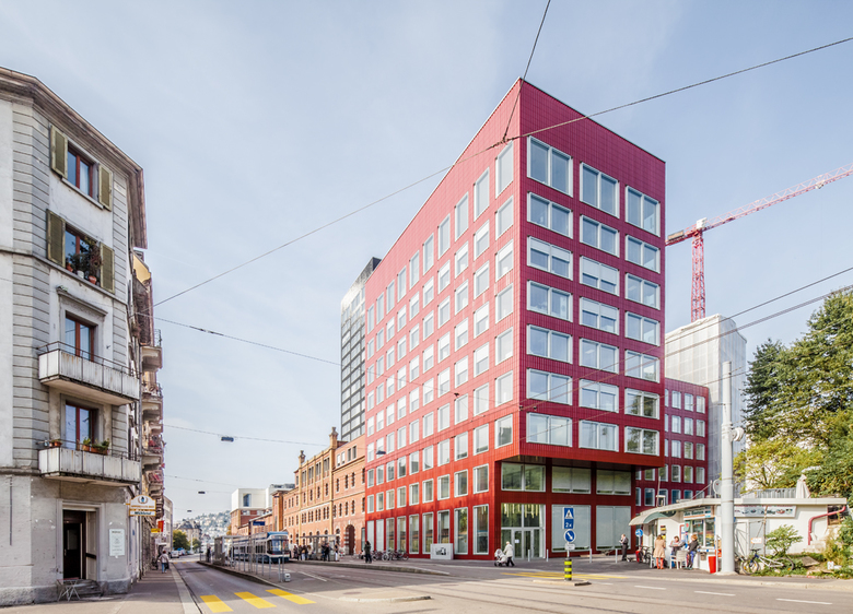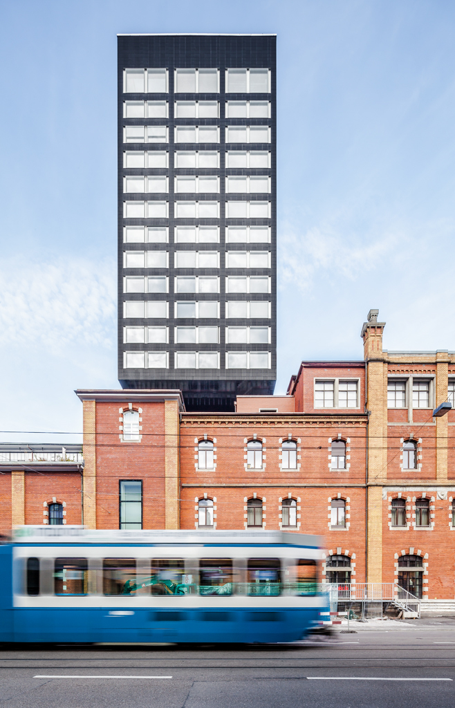 Das Hochhaus in der Mitte des Löwenbräu-Areals wirkt als Schwer- und Drehpunkt der Anlage. Ein Neubauvolumen setzt einen deutlichen Akzent an der Ecke Limmatstrasse/Dammweg und bildet zusammen mit dem Stahlsilo und Hochhaus eine volumetrische Verdichtung. Als Gegenstück werden die Aufstockung der Kunsthalle an der Ecke Limmatstrasse/Gerstenstrasse und die beiden hohen Häuser des Swissmill-Areals wichtig. Es entsteht eine ausgewogene Gruppe hoher Häuser, die einen markanten, wiedererkennbaren Ort im Quartier bilden.