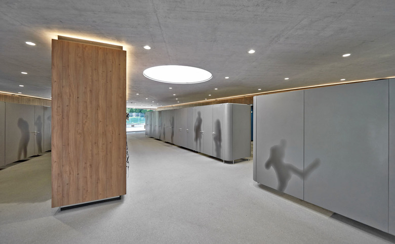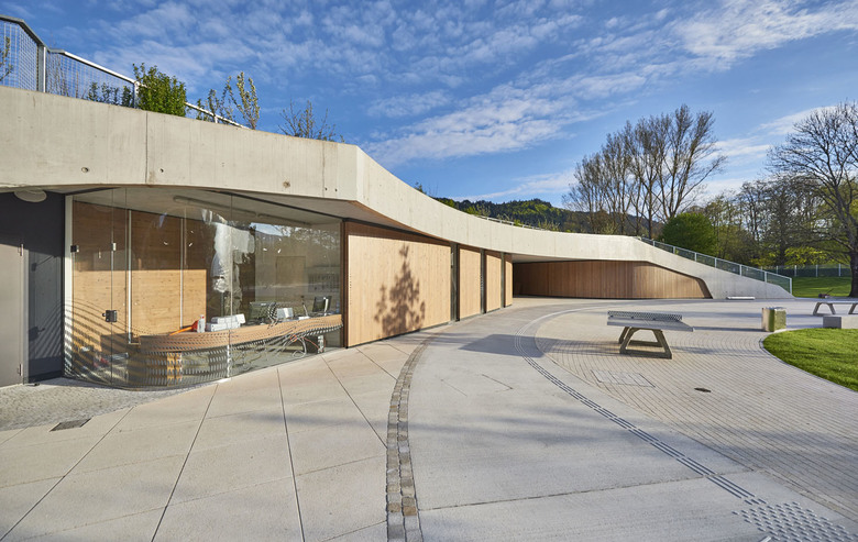 Erschließungshügel und Loungegebäude – Das neue hügelförmige Eingangsgebäude führt den Besucher in den Innenbereich und bildet in seiner äußeren Gestalt nach Nordwesten hin eine Abschottung zu den angrenzenden Sportflächen. Die Dachflächen sind Grün- und Liegeflächen für das Freibad. Es finden sich dort Kassen, Umkleiden, Nassbereiche und Technikräume. Die hochwertige Möblierung und die Oberflächen aus Holz und Sichtbeton prägen die Innenbereiche. Natürlich belichtet ist der Bereich über Oberlichter als auch durch zusätzliche Fassadenöffnungen zu den Sportflächen. Der Zugang durch die bisherige Erschließung im Südwesten ist weiterhin möglich aber untergeordnet. Das bestehende Gebäude wurde bis auf das Untergeschoss rückgebaut und darüber bildet eine eine loungeartige Überdachung aus Holz den markanten Abschluss der Badeflächen nach Süden und Westen hin. Diese leistet den notwendigen Schallschutz und bietet im Rückbereich Lagerflächen, bzw. Vereinsräume. Vorgelagert ist eine hochwertige Holzterrasse und Tribünen. Die Lounge entwickelt sich aus der Verlängerung des Zugangsgebäudes mit einer Fassade aus stehenden Lamellen, die das Freibad begrenzen aber auch Durchblicke zulassen.