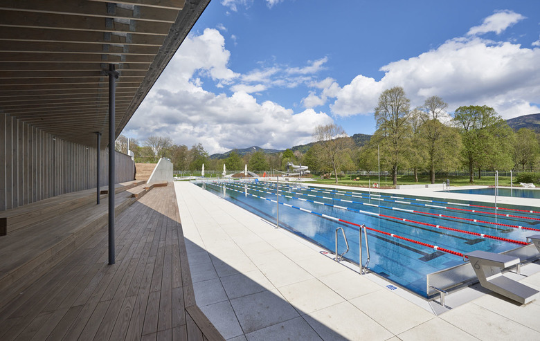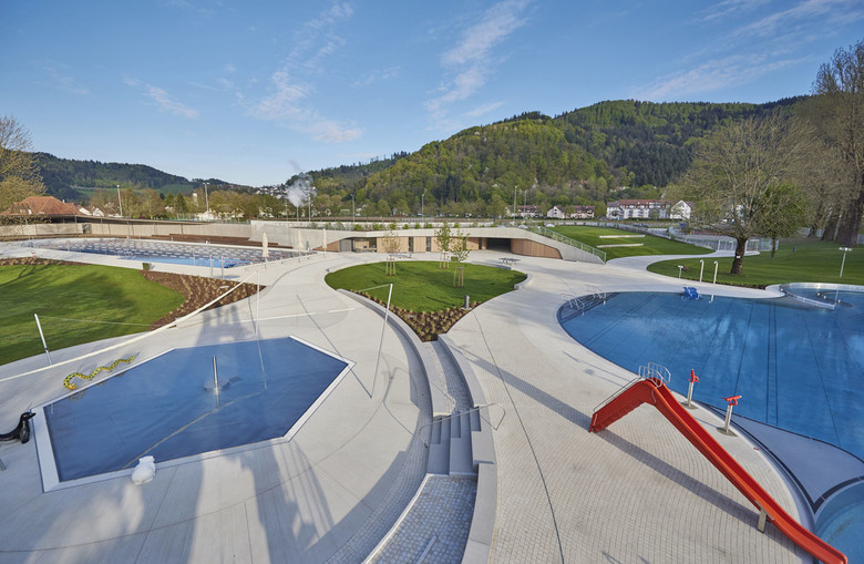 Architektur-Landschaft – Das Freibad aus dem Jahr 1968 wurde umfassend neugeordnet und hochwertig modernisiert. Die baulichen Maßnahmen sind der Landschaft untergeordnet und gleichen in ihrer Erscheinung eher einer Modellierung der Frei- und Grünflächen des Geländes als sichtbaren Gebäuden.