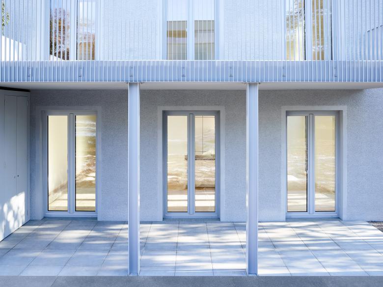 Die Erschließung erfolgt über separate Eingänge, die die Individualität jedes Gebäudes unterstreichen. Die Häuser sind durch ein gemeinsames Untergeschoss verbunden, das neben Technik- und Kellerräumen auch eine Tiefgarage umfasst. Die Zufahrt erfolgt über eine bereits bestehende Rampe, wodurch die Flächenversiegelung auf ein Minimum reduziert wurde.