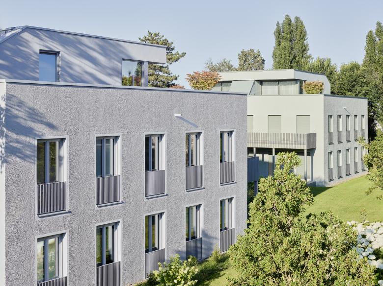 Das Ensemble umfasst drei neu errichtete Mehrfamilienhäuser sowie ein Bestandsgebäude, die in eine weitläufige, über 5.000 m² große parkähnliche Gartenanlage eingebettet sind.