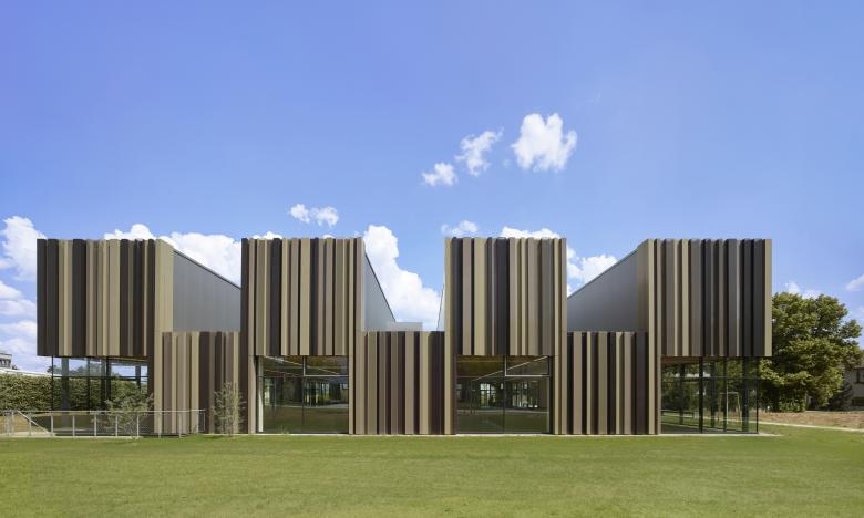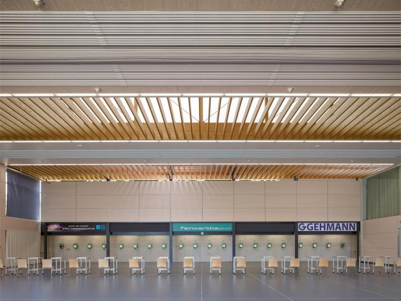 Alle erdberührenden Bauteile bestehen aus Stahlbeton, ebenso die begrünte Decke über der Kleinkaliberanlage. Das Dach der Drucklufthalle und des Versorgungsgebäudes ist eine effiziente Holzkonstruktion: 6 weitspannende Holzträger ermöglichen einen Rhythmus von geöffneten und geschlossenen Bauteilen. Die geöffneten Bauteile sind verglast, schaffen Tagesbelichtung und ermöglichen eine natürliche Be- und Entlüftung. Darüber hinaus entsteht eine direkte Leitungs-Wegeverbindung zur Technikzentrale auf Dachebene.