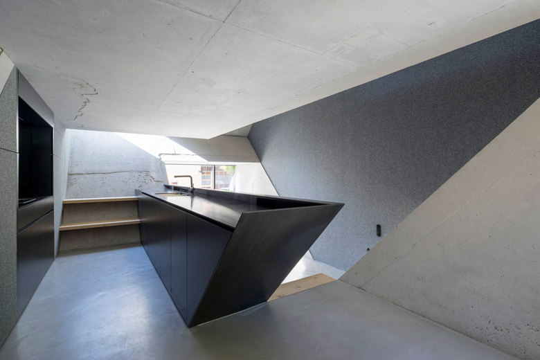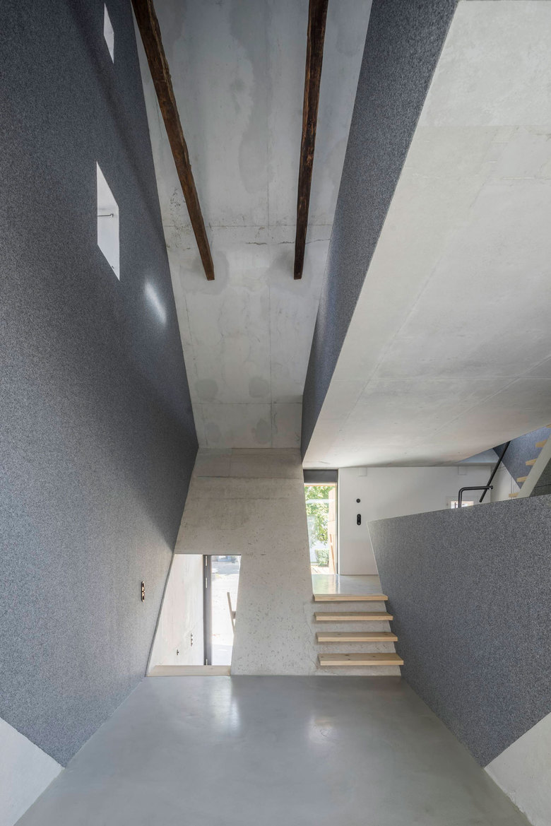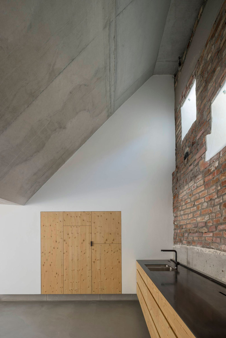 Die architektonische Konzeption geht von zwei Prämissen aus: Erhalt historischer Bausubstanz bei gleichzeitiger Einführung einer räumlichen Innovation. Daher wird „nur“ ein bestimmendes, raumbildendes Element eingefügt: ein um 45 Grad gedrehter, in den Dachstuhl eingefügter Kubus aus Beton, der sich an der Geometrie des Bestandes orientiert und über die gesamte Länge des Gebäudes erstreckt. Innerhalb dieses auf die Spitze gestellten Kubus findet sich eine hochmoderne Einheit in dem ehemaligen Stall des Anwesens. Außerhalb des Kubus existiert in engem Bezug zum Bestand eine zweite Einheit, die das Historische so weit als möglich erhält und spürbar werden lässt. Da sich der Betonkubus von Norden nach Süden staffelt, verschränken sich Raumteile des Bestandes mit Elementen des Kubus.