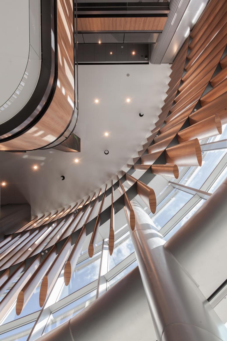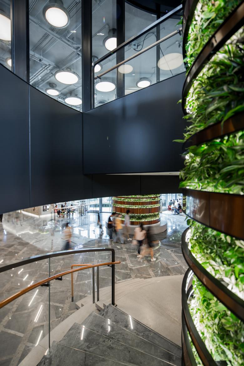 A grand spiral stair connects the second to the third level 4,300m² podium garden, equipped with a jogging path. The criteria for a WELL certification that includes air, water, nourishment, light, fitness, comfort and mind are carefully integrated to achieve a healthy work place amidst a stark, industrial context being transformed.