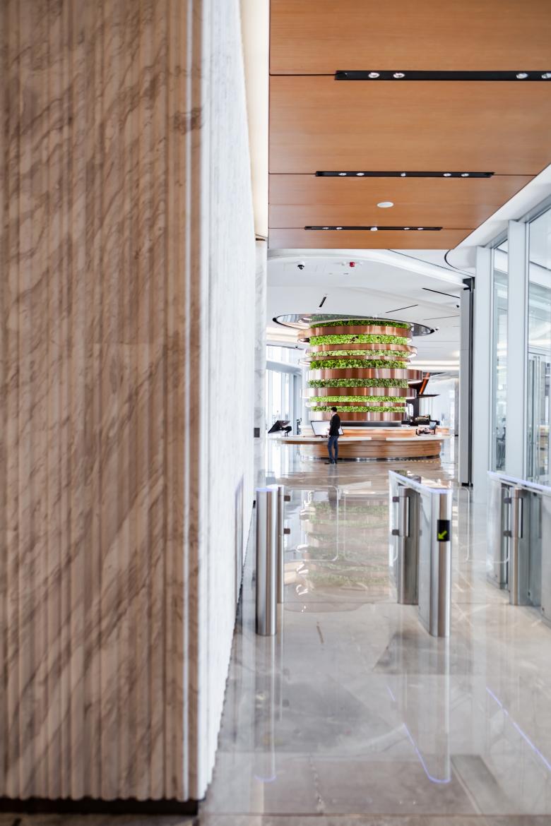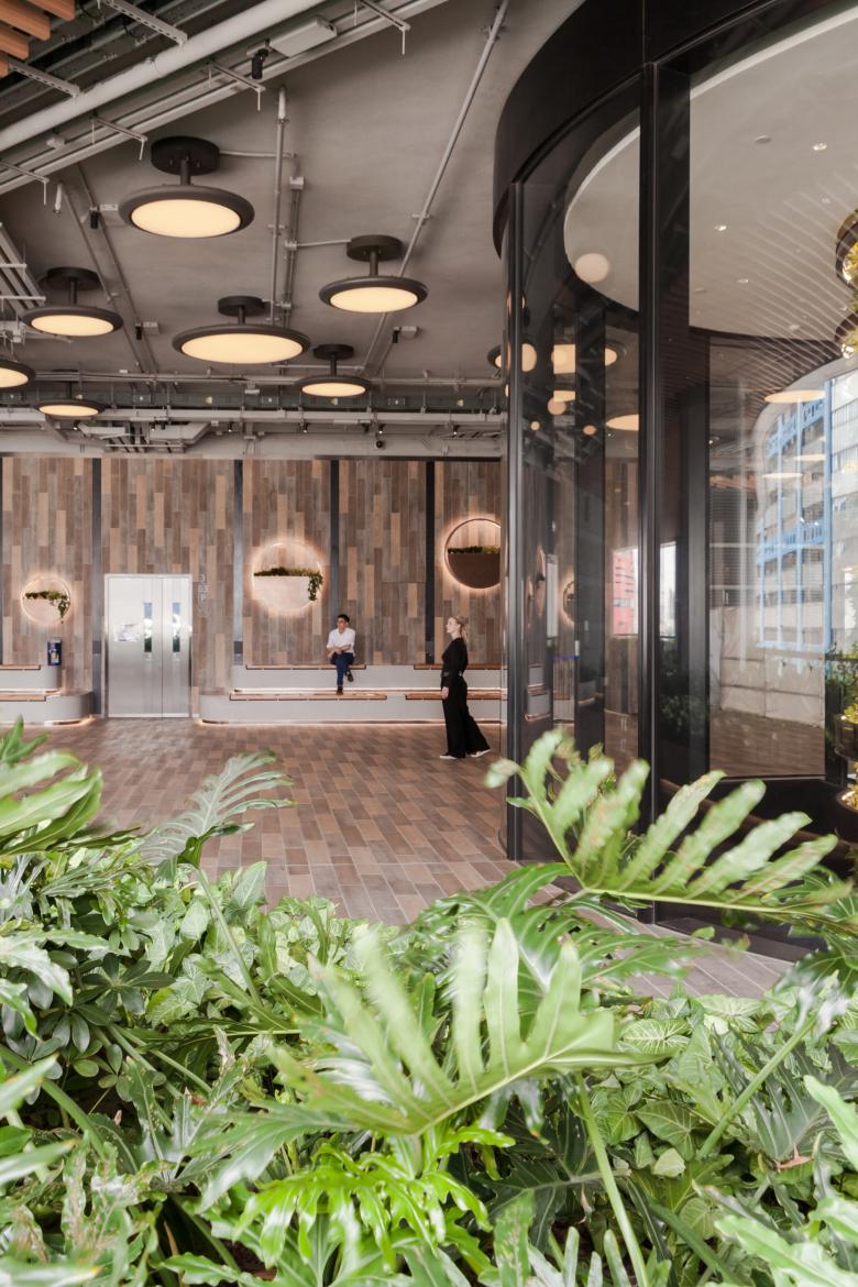 With the office lobby on the ground level, retail on the first and second levels, and a large green podium on the third level, circular openings were created to visually connect and integrate the various functions, while planting with self irrigation and lighting system forms column structures puncturing through these openings.