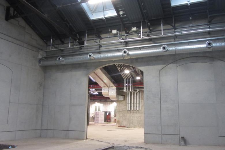 Die kompletten lüftungstechnischen Anlagen der Komfortbereiche wurden in den Kellern der verschiedenen Veranstaltungsräume platziert, wovon die Luftverteilung dann direkt in die darüber liegenden Geschosse erfolgte. In den Geschossen selbst wurden die Luftmengen einzelner Stränge über variable bzw. konstante Volumenstromregler auf die entsprechenden Sollwerte automatisch abgeglichen. Die zur Funktion der Veranstaltungsflächen notwendige Anlagentechnik wurde, dem neuen Raumkonzept entsprechend, eingestellt. Die Kanäle, Luftauslässe, Wickelfalzrohre und Volumenstromregler verlegte man in den verschiedenen Räumen in Sichtmontage oberhalb der Abhangdecke. Die betreffende Nutzfläche wird jetzt von sechs raumlufttechnischen Anlagen be- und entlüftet und sorgt für ein angenehmes Frischeklima.