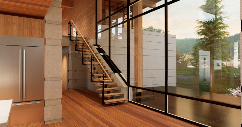 Triple pane glass and super insulation (R-30 walls and R-60 roofs) create the thermal envelope, while hydronic radiant floors, powered by a ground source heat pump, heat and cool the home. The heat pump also supports a supplemental forced air system, providing fresh air from HRV’s and an estimated EUI of 0.50.