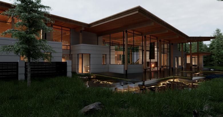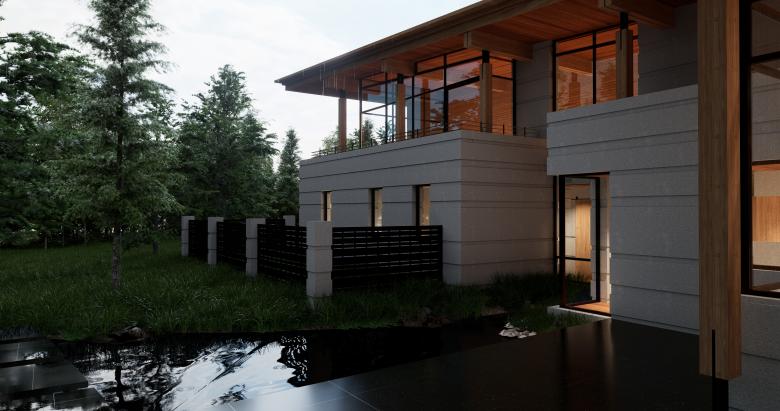Board-formed concrete plinths create a maintenance-free base for the second floor areas, while sod roofs furnish them with inviting terraces. Small sections of cedar siding bring warmth to the material palette, while hardwood floors, natural stone, and cedar ceilings transfer the warmth into the interior spaces. Ground level terraces extend the living areas beyond the confines of the house. While water from the abundant aquifer is used for a water feature encircling the home.