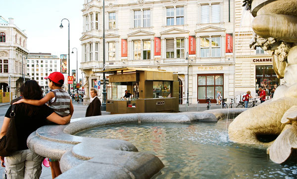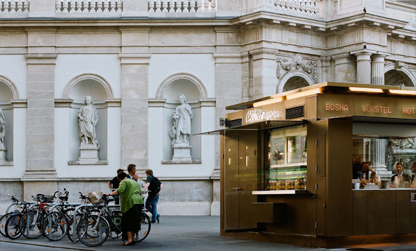 Aufgabenstellung war es den typischen Wiener Würstelstand architektonisch zu reflektieren und neu zu interpretieren, nicht zu letzt in seiner Rolle als Treffpunkt und Kommunikationsort für unterschiedlichste Kunden. Gleichzeitig sollte den Traditionen eines Würstelstands liebevolle Wertschätzung und Respekt gezollt werden. Die Balance zwischen diesen beiden Prämissen – nicht unwichtig für den prominenten Albertinaplatz– zeigt sich sowohl in der Formensprache als auch in der Überlegtheit kleiner Details und Materialien.