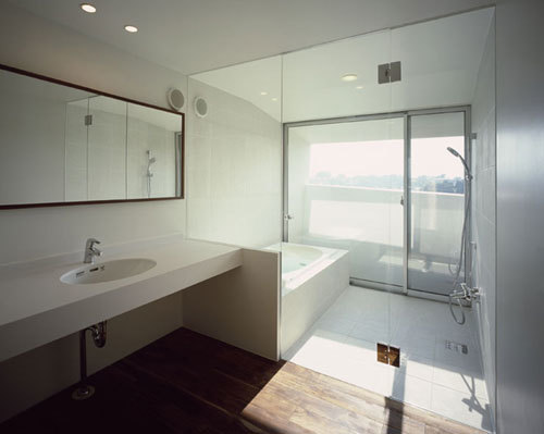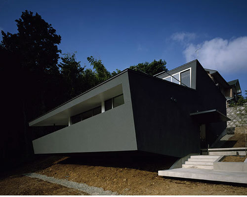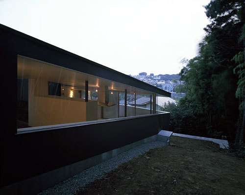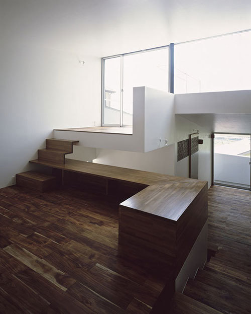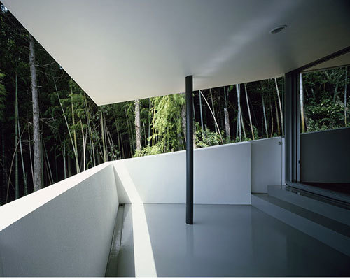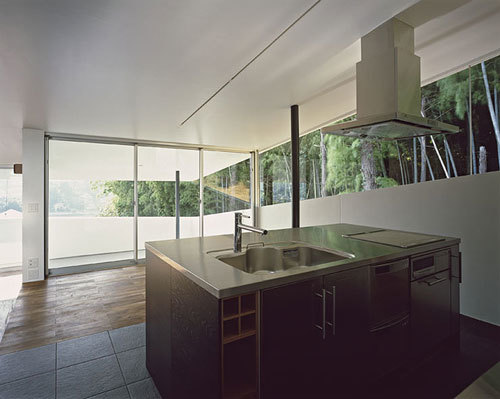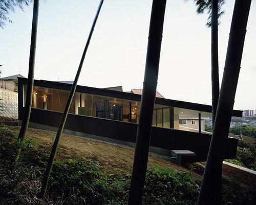 The building, which is almost square in plan, is placed in the center of the slope, with L-shaped walls on the south and east perimeters, where the neighboring houses are close by, and waist walls on the north and west perimeters, where there is a good view of the site. The height of the waist wall is lowered toward the northwest corner, creating a space in which the southeast corner is the most closed and the northwest corner is the most open. In other words, the opening of the perimeter wall creates a gradation of openness in the interior space in the diagonal direction. Because of its deep flat shape, a small court was created in the center of the building to let in light and at the same time create a circular structure of space. Around the court, the floor was placed at different levels, tracing the topography of the slope. Finally, a single-flow roof was applied in the same direction as the slope. The client did not request the creation of private rooms separated by walls, so the spaces are connected while being gently divided by the difference in floor levels. In the northwest corner, the most open space, there is a deep terrace. Surrounded by the roof and a hip wall, it is an outside room that is as close to the interior as possible. To the east, one level above the terrace is the dining room and kitchen, which enjoys a cut-away view of the bamboo grove to the north. Meanwhile, to the south is the living room, which opens to the west and offers a view of the Tanzawa mountains. The bedroom is located at the most secluded and elevated level. By raising the roof of the upper part of the bedroom toward the west, a view is secured and a terrace for drying clothes is created at the roof level. In this way, each place opens differently to the outside, thus developing a variety of places.