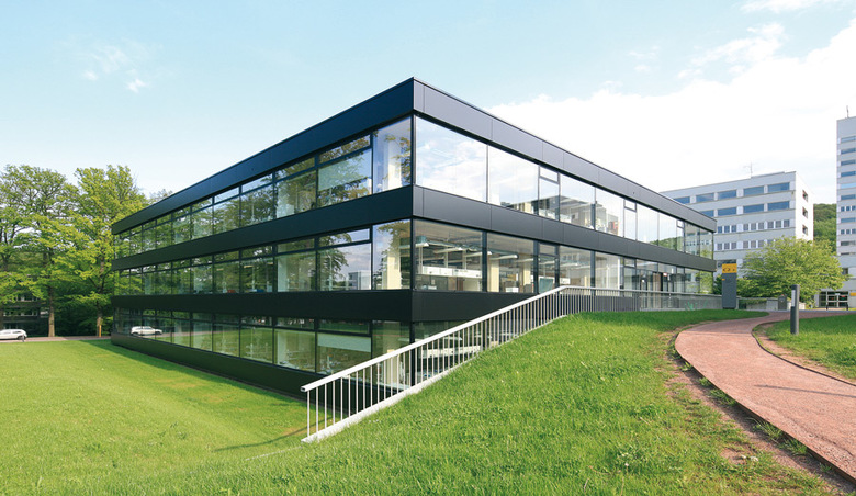 Besonderheiten und technische Innvoationen: Punktförmig gestützte Decken, nichttragende Innenwände als Fertigteile, hoch installierte Gebäudeteile, Gründung auf Einzelfundamenten und Bohrpfählen, umlaufende Glasfassaden
