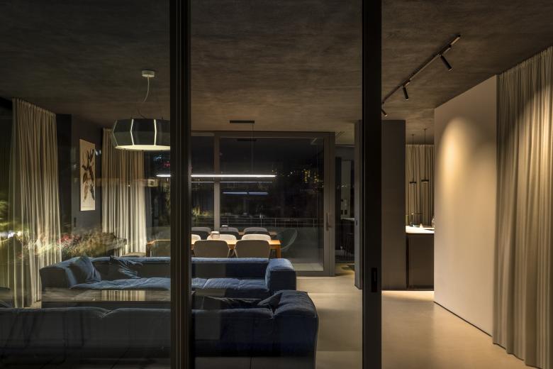 The living room is a contemporary space, fully glazed all around and can be connected to the terrace by means of large sliding doors. The interior/exterior lines blur, creating a special covered open space in the middle of the city.