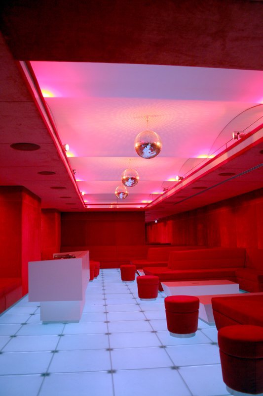Die Farbe Rot, meist in Verwendung samtbezogener Flächen, zieht sich als verbindender Baustein durch das Etablissement, wird zum Wandelement oder Sitzmöbel. Als starken Kontrast dazu wurde ein weißer Lichtboden gewählt, die wichtigsten Möbelstücke wie die lang gestreckte Bar und das DJ- Pult sind ebenfalls in weiß gehalten und stehen als strahlende Punkte im Raum. Spiegelelemente an Wand und Decke tragen zur Komplexität des Raumes bei - kurzfristige Zeitreisen in die Zeit der 70 er Jahre sind nicht ausgeschlossen, futuristisches Design inklusive.