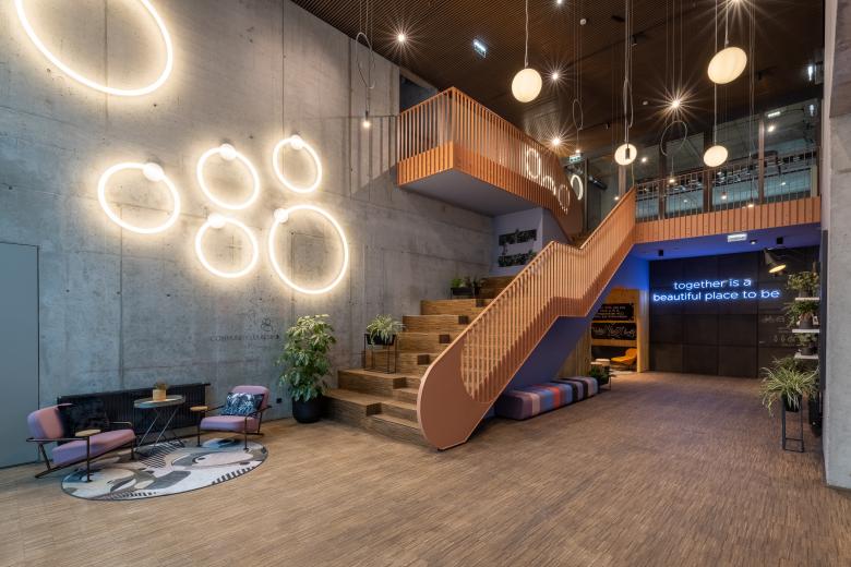 In den Begegnungszonen strahlen Möbel mit rustikalen Holzoberflächen, schlichte Lampen und Stahlformrohre einen industriellen Charme aus. Die Gemeinschaftsflächen werden dynamisch und jugendlich gestaltet. Den Begegnungsbereichen wird ein künstlerisches Finish gegeben, durch eine Zusammenarbeit mit regionalen Künstlern - welche sich in verschiedenen Räumen verwirklichen können.