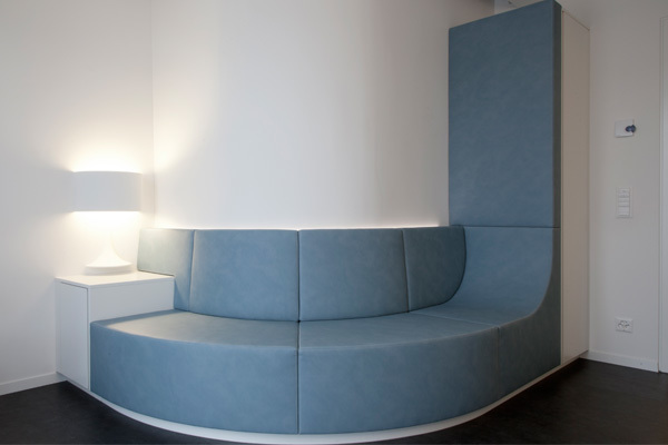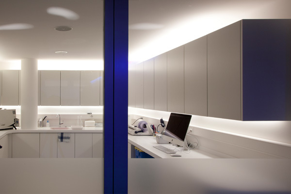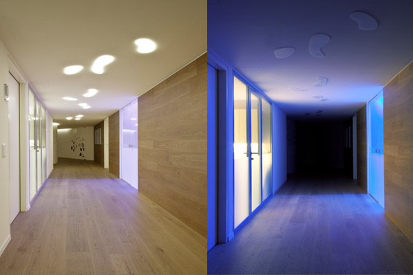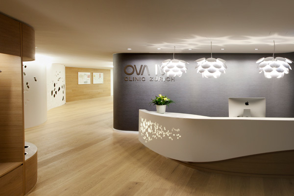 Die Innenarchitektur der Kinderwunschklinik im Gewerbehaus Puls 5 zeichnet sich durch seine fliessenden Formen und sein heiteres Ornament aus. Die Beleuchtung unterstreicht die gestalterische Idee durch fliessende Linien, Leuchten in weichen Formen und Objektleuchten, die den Räumen einen positiven Ausdruck verleihen. Ziel der Beleuchtung ist, die funktionalen und atmosphärischen Anforderungen so umzusetzen, dasseine gelassene und gleichzeitig heitere Atmosphäre entsteht. Die internen Laborräume bilden durch die kühlere Lichtfarbe und einen blauen Akzent den technologischen Kern der Klinik. Sie stehen im Kontrast zu den Räumen, in denen sich die Patienten aufhalten.